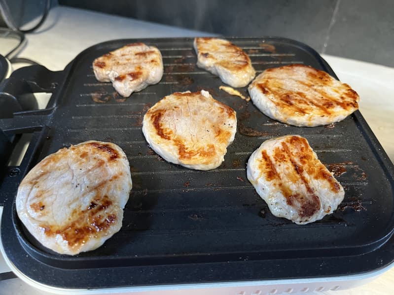 Через 2 минуты перевернули свинину, и увиденное нам понравилось: мясо поджарилось, но осталось сочным.