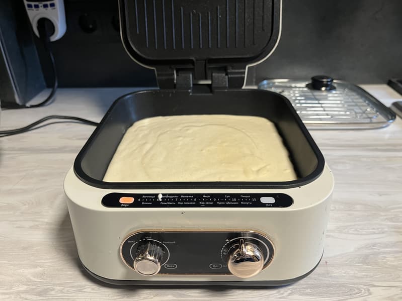 Спустя 5 минут мы начали ощущать запах выпечки. Открыли крышку и увидели, что тесто схватилось, но сверху осталось совсем светлым, а вот по краям уже можно было наблюдать румяную корочку. Тогда мы уменьшили нагрев нижнего тэна до минимума, а гриль, наоборот, включили на максимум.