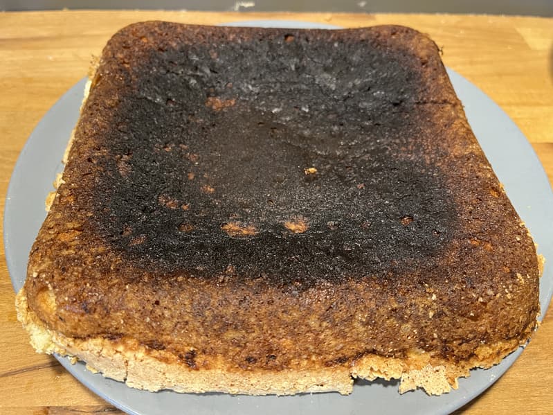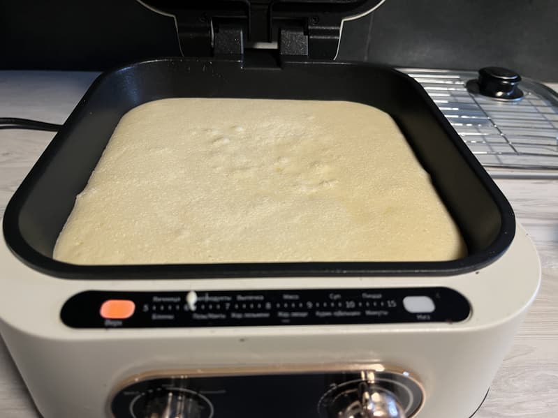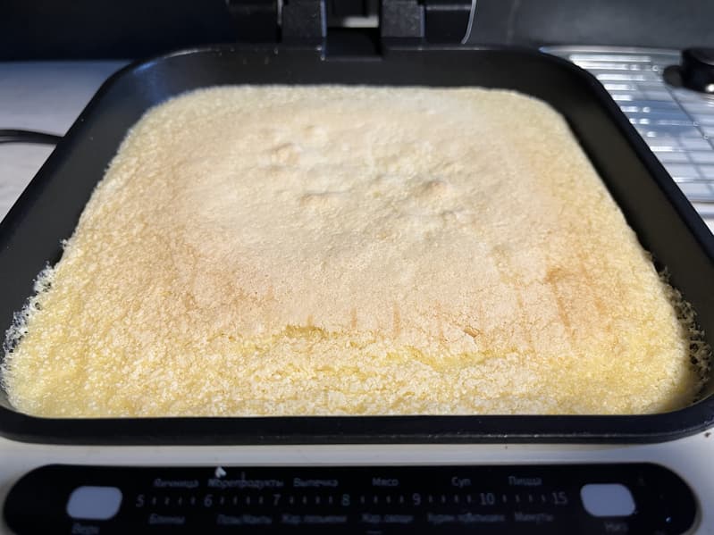 Бисквит стал румяным сверху, но при проверке теста с помощью зубочистки, мы выяснили, что внутри он всё еще жидкий. Тем временем снизу бисквит уже полностью пропекся, и продолжение нагрева или тем более увеличение мощности нижнего тэна привело бы к подгоранию, поэтому нам не оставалось ничего другого, кроме как выключить нижний тэн, закрыть крышку и надеяться, что гриль сможет пропечь бисквит сверху.