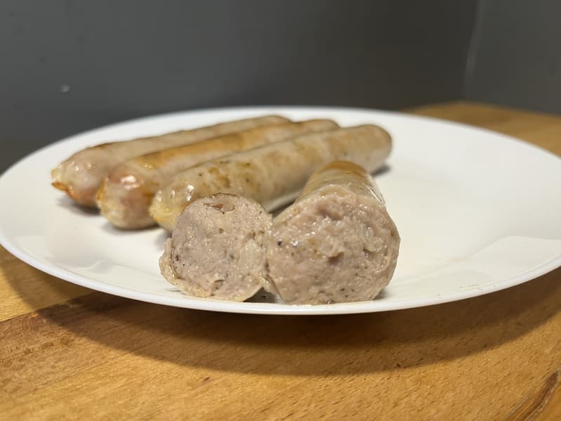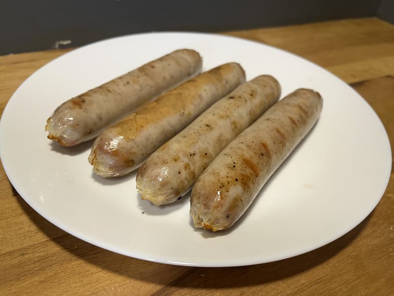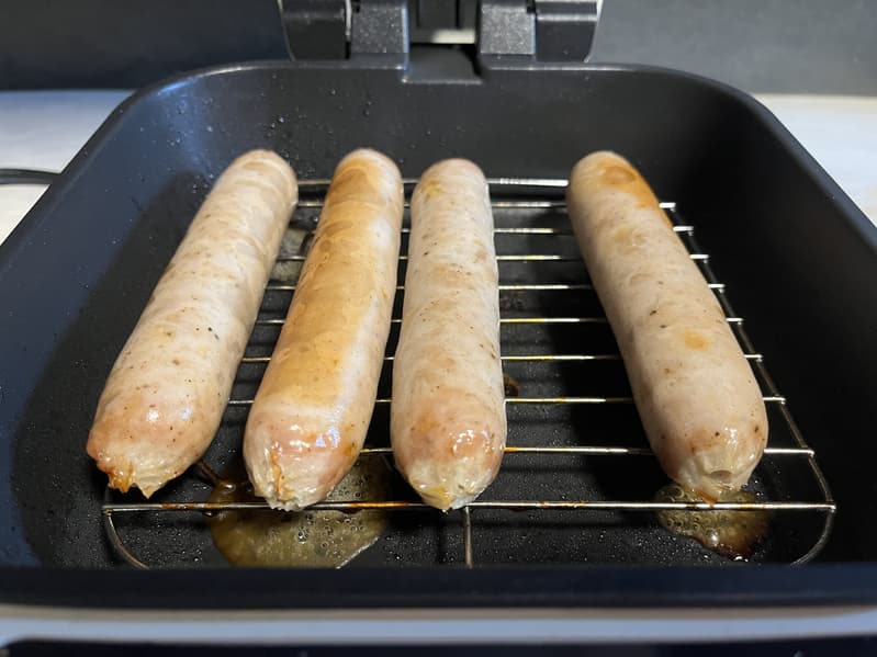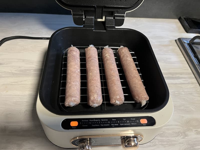 Результат нас очень порадовал — колбаски получились сочные, румяные, а лишний жир стек вниз благодаря решетке.