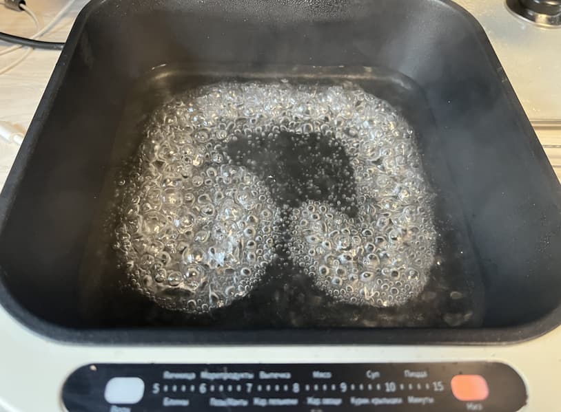 На фото хорошо видны зоны кипения, которые образуют приблизительный узор конструкции тэна. Хотелось бы, чтобы и в центральной части происходил нагрев — возможно, тогда наш бисквит всё же смог бы пропечься при выставленном минимальном уровне мощности кастрюли изначально.