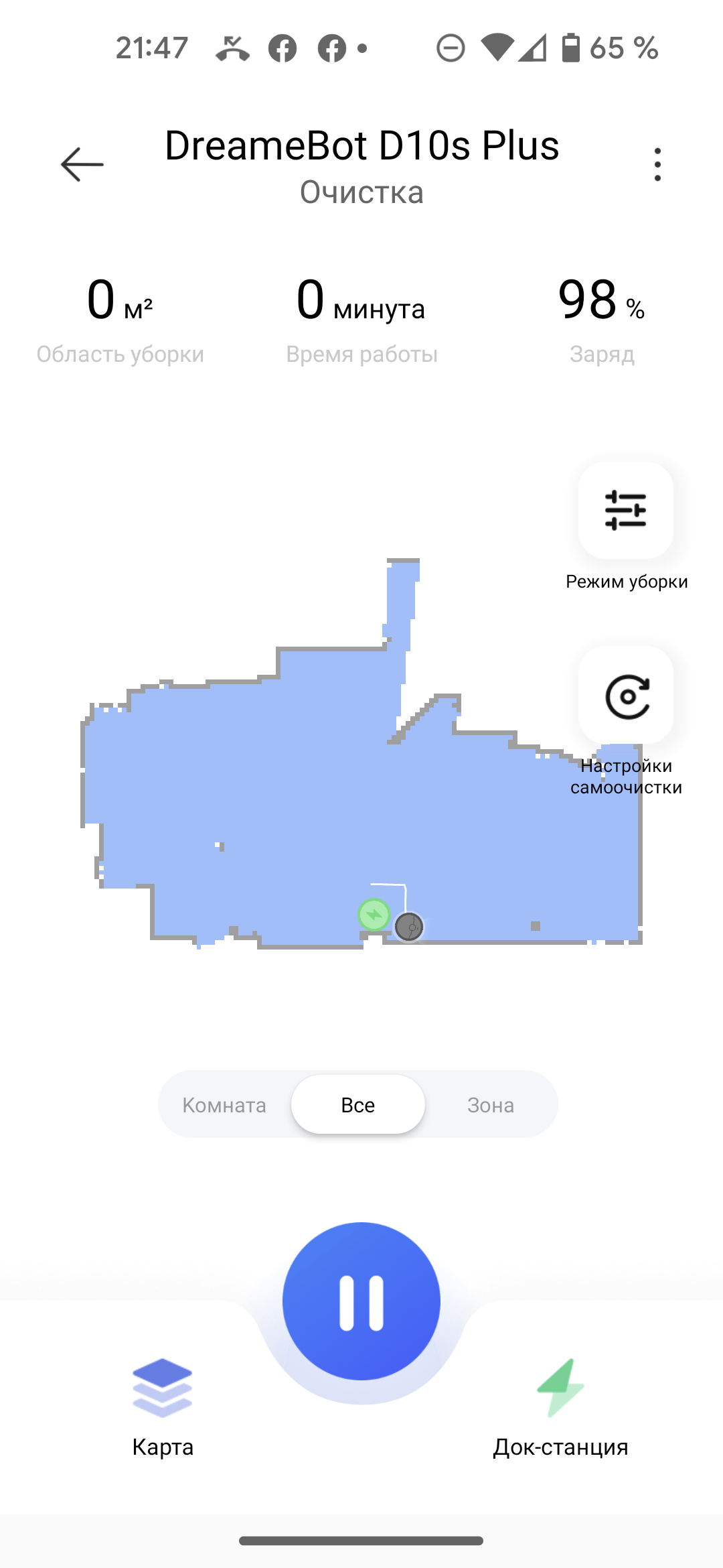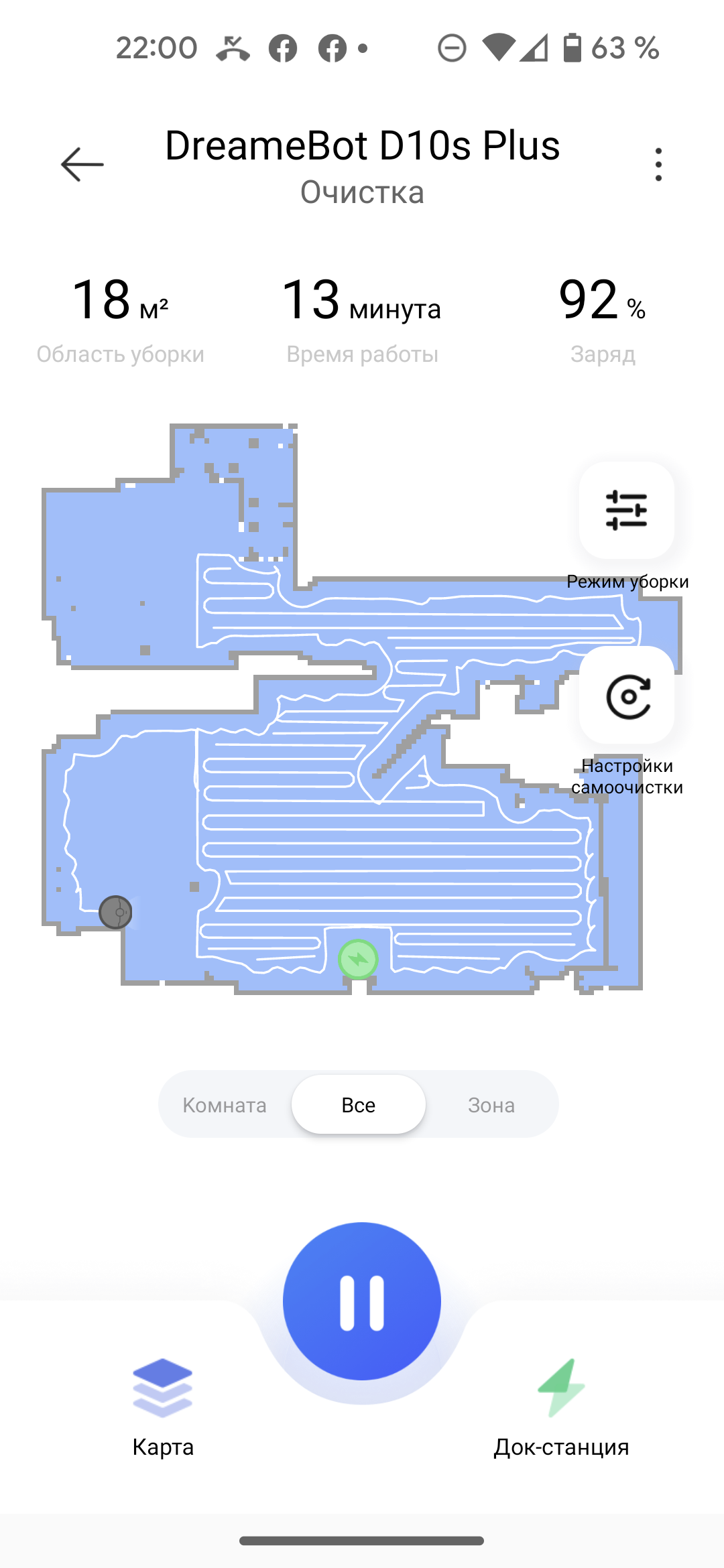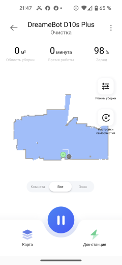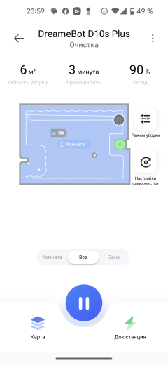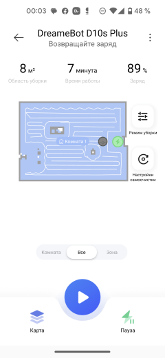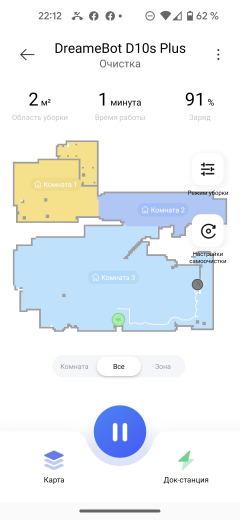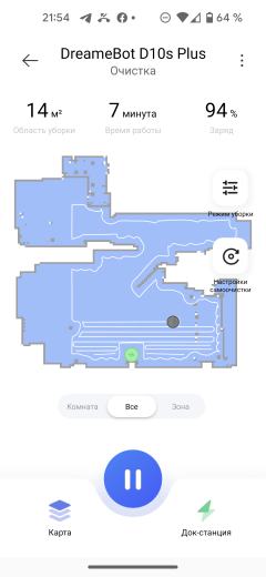 Оказавшись в незнакомом помещении, Dreame D10s Plus сразу окидывает лазерным взором его границы и, приступая к первой уборке, начинает рисовать на экране мобильного приложения новую карту, на которой уже есть стены и другие препятствия, распознанные сенсором. В процессе карта улучшается. Новое помещение робот обходит квадратами со стороной около 3,5 м, сначала по периметру, а затем зигзагообразной «змейкой» подметая внутреннюю площадь.
