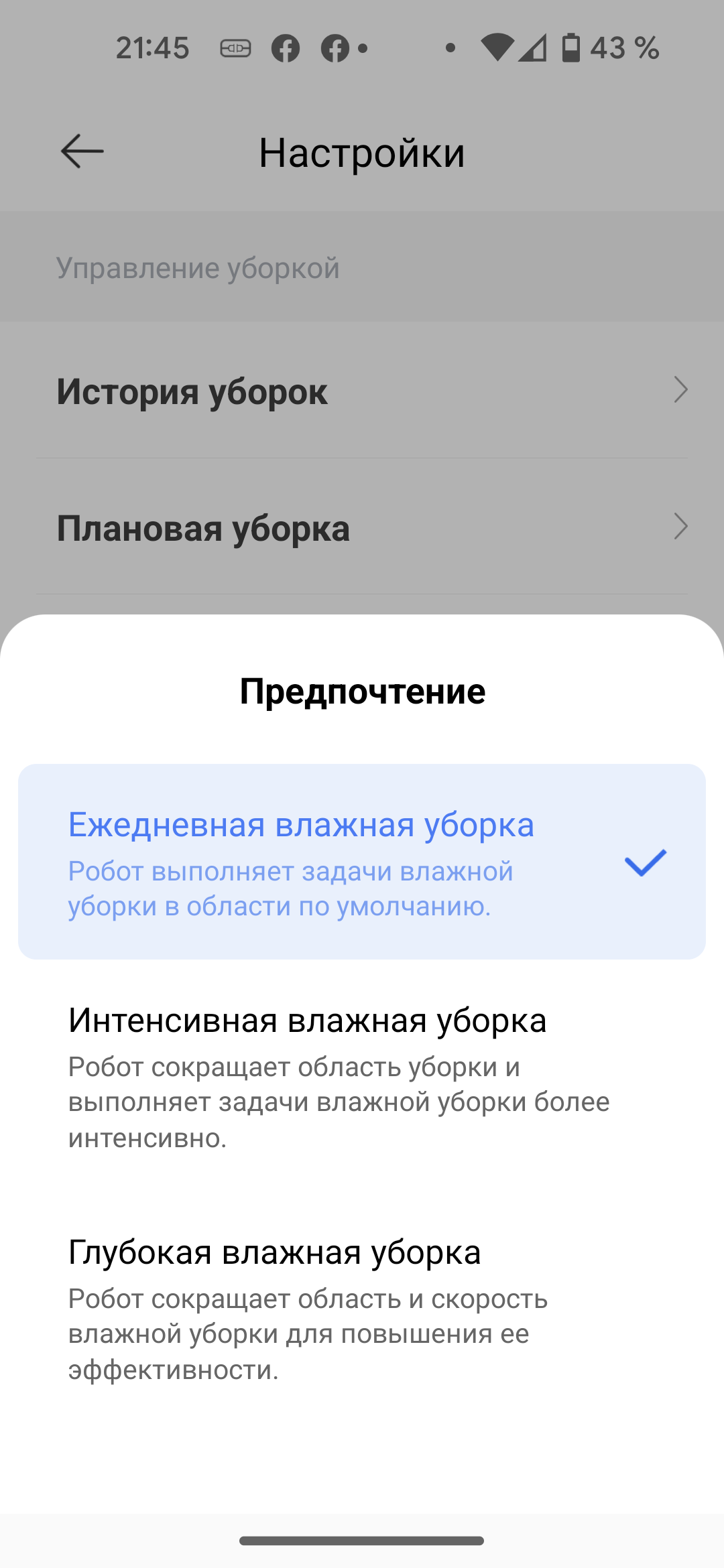 Здесь же, в режиме настроек, можно отрегулировать интенсивность увлажнения при мытье пола.