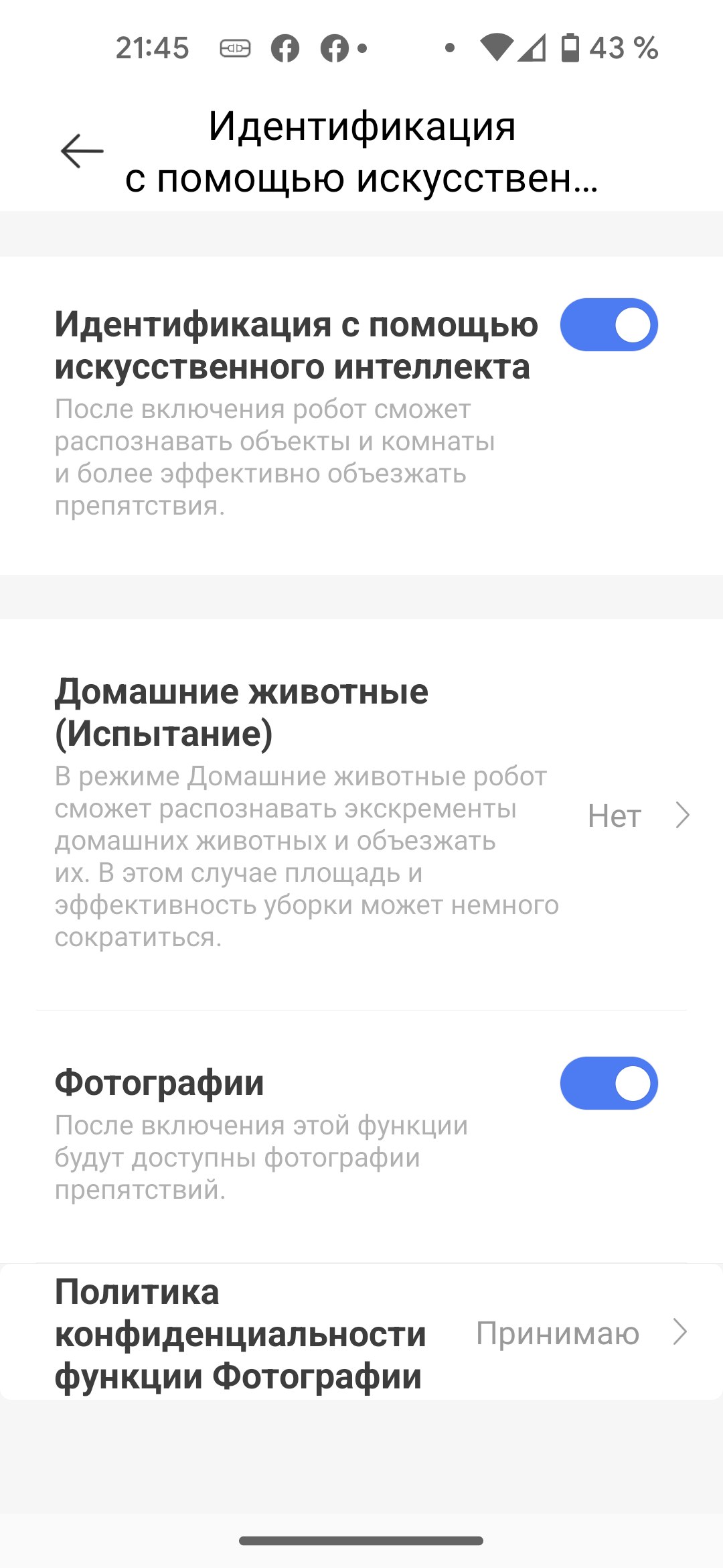 Следующий пункт настроек касается использования курсовой камеры робота и искусственного интеллекта, позволяющего распознавать препятствия. Эта модель умеет пользоваться картинкой с матрицы, улучшая ориентирование. Для тех, кто неуютно чувствует себя в под наблюдением ползающего по дому электронного глаза, эту опцию можно отключить.