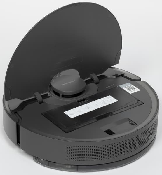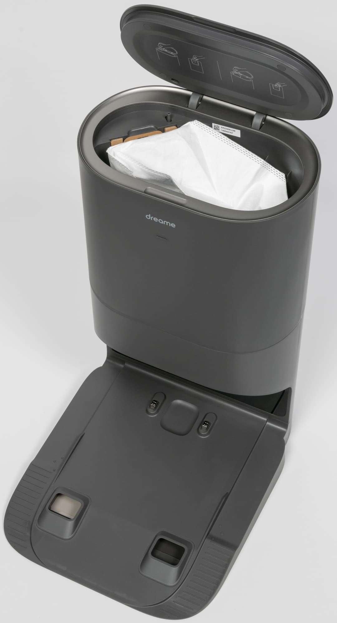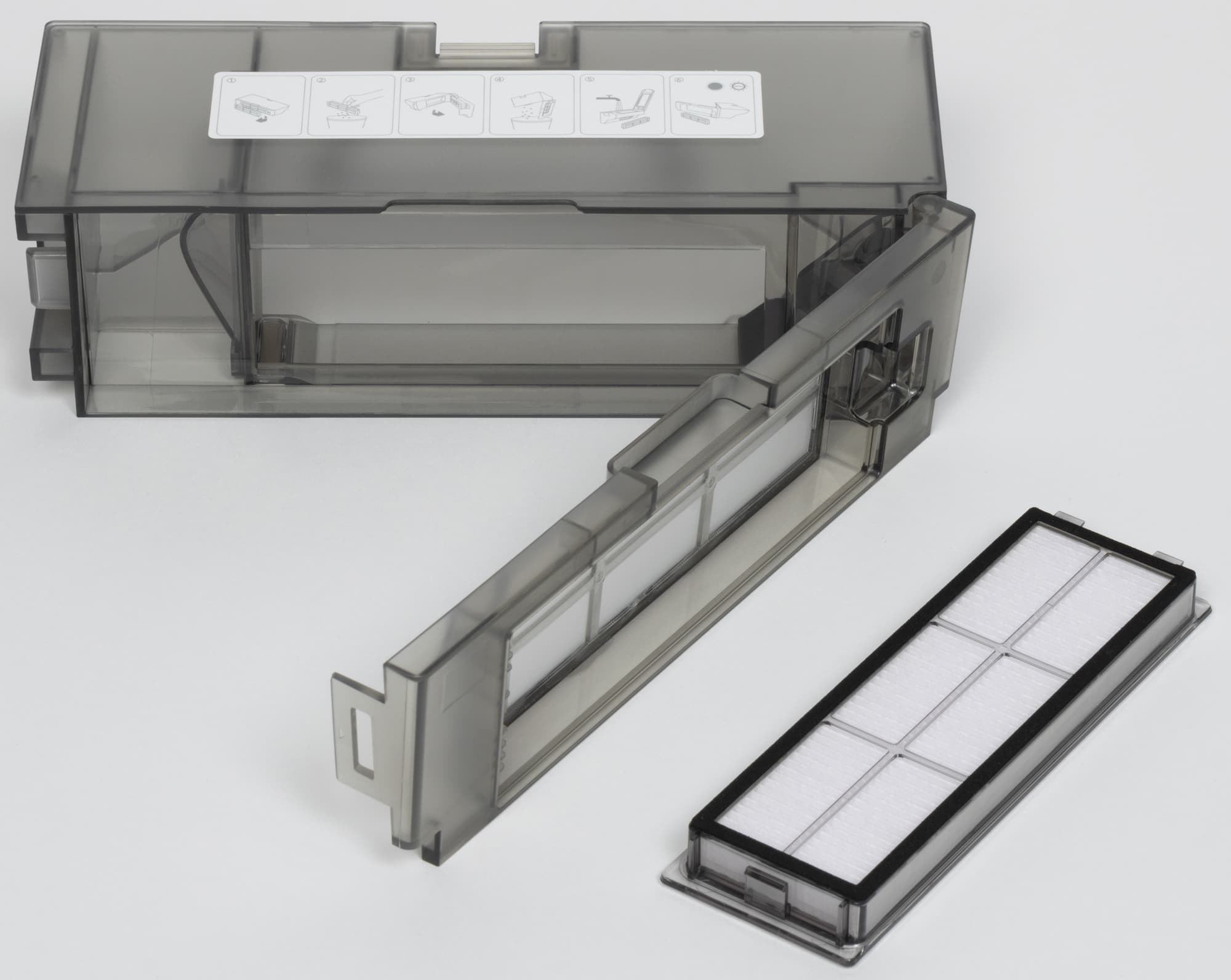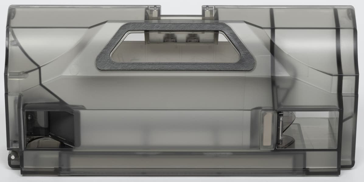Он сделан из полупрозрачного серого пластика, и у него есть любопытная особенность конструкции: помимо традиционного отверстия, через которое в емкость попадает мусор, на дне — еще два: входное и выходное, соответствующие окошкам на дне корпуса робота. При работе системы самоочистки поток воздуха из встроенного в базу стационарного пылесоса продувает контейнер насквозь и уносит скопившиеся внутри мусор и пыль.