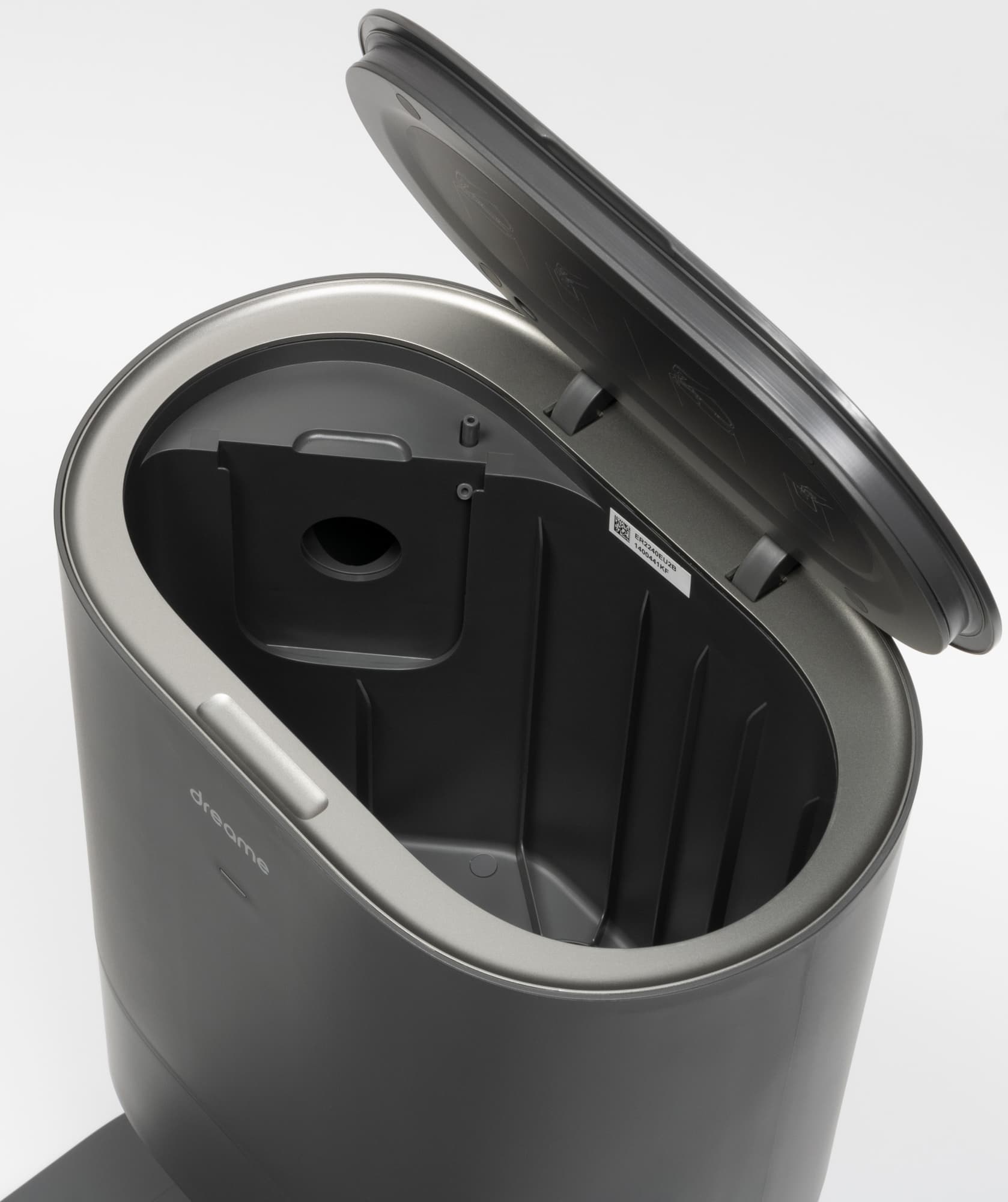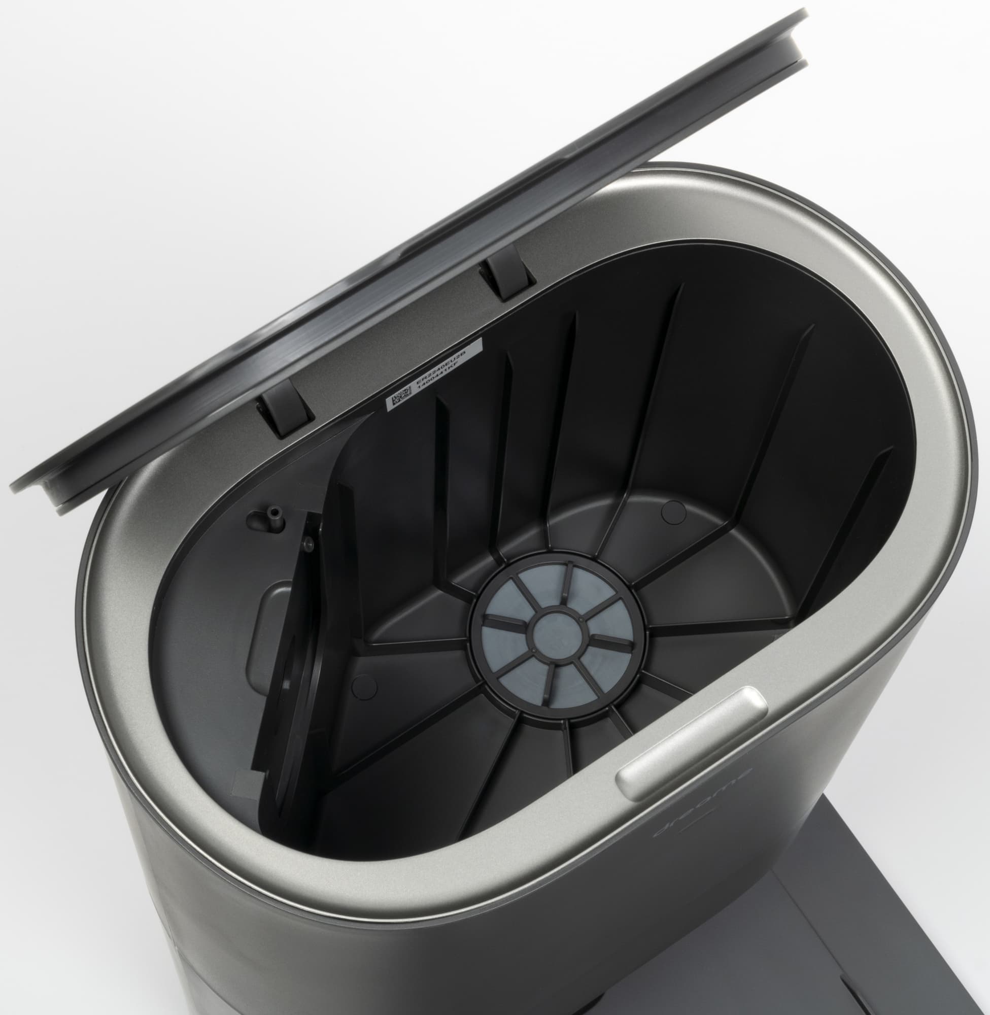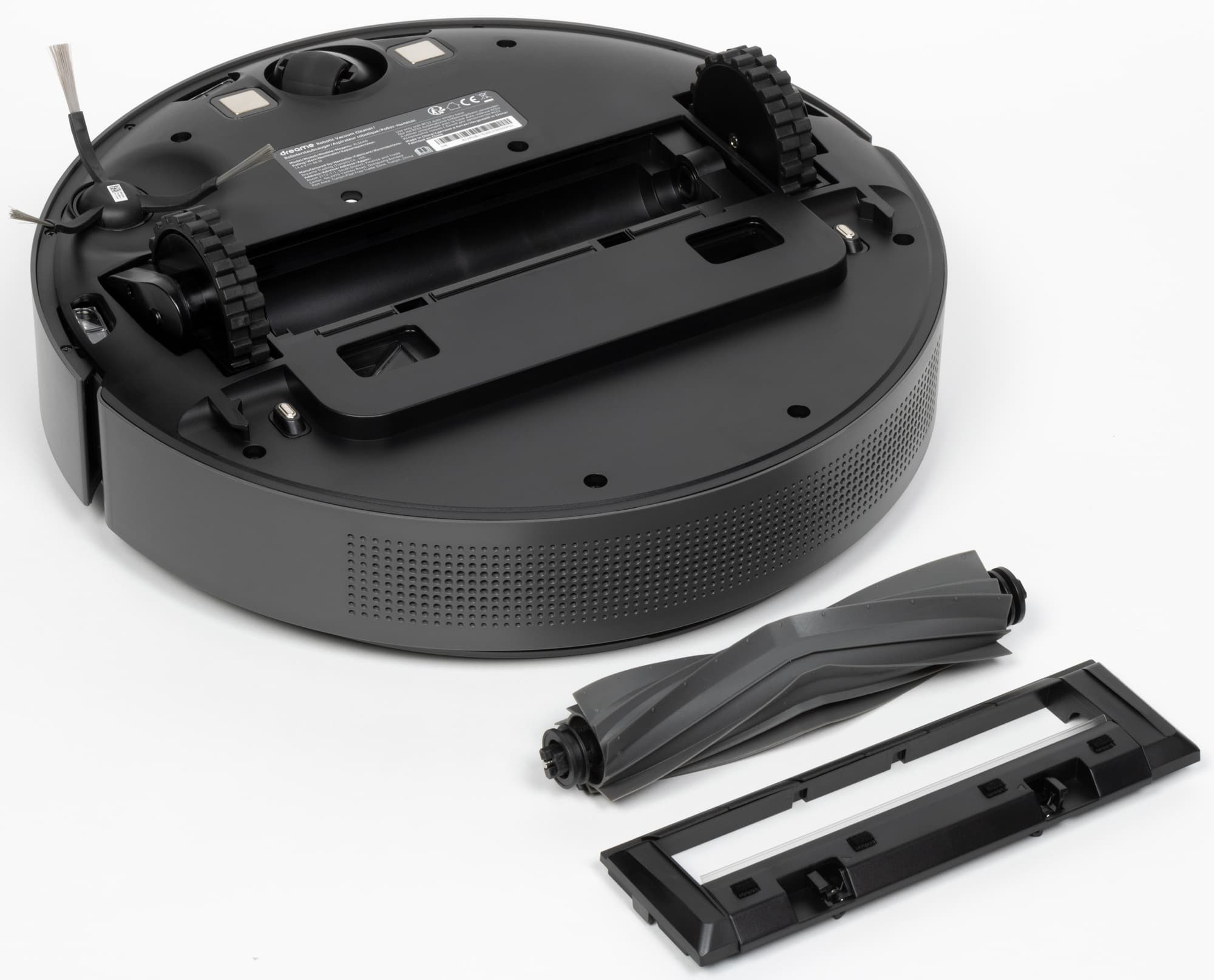 Он сделан из полупрозрачного серого пластика, и у него есть любопытная особенность конструкции: помимо традиционного отверстия, через которое в емкость попадает мусор, на дне — еще два: входное и выходное, соответствующие окошкам на дне корпуса робота. При работе системы самоочистки поток воздуха из встроенного в базу стационарного пылесоса продувает контейнер насквозь и уносит скопившиеся внутри мусор и пыль.
