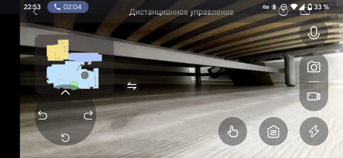 Наш робот позволяет заглянуть и под мебель — к примеру, в поисках потерянной вещи. Кнопками в правом нижнем углу можно в любой момент запустить уборку в автоматическом режиме или отправить устройство на базу.