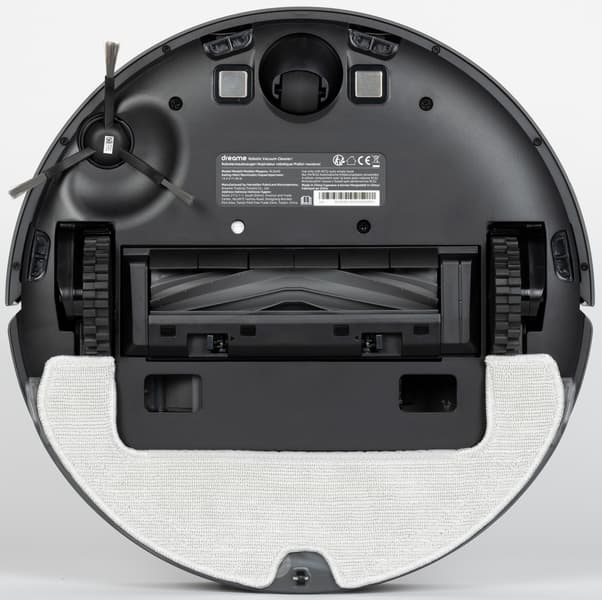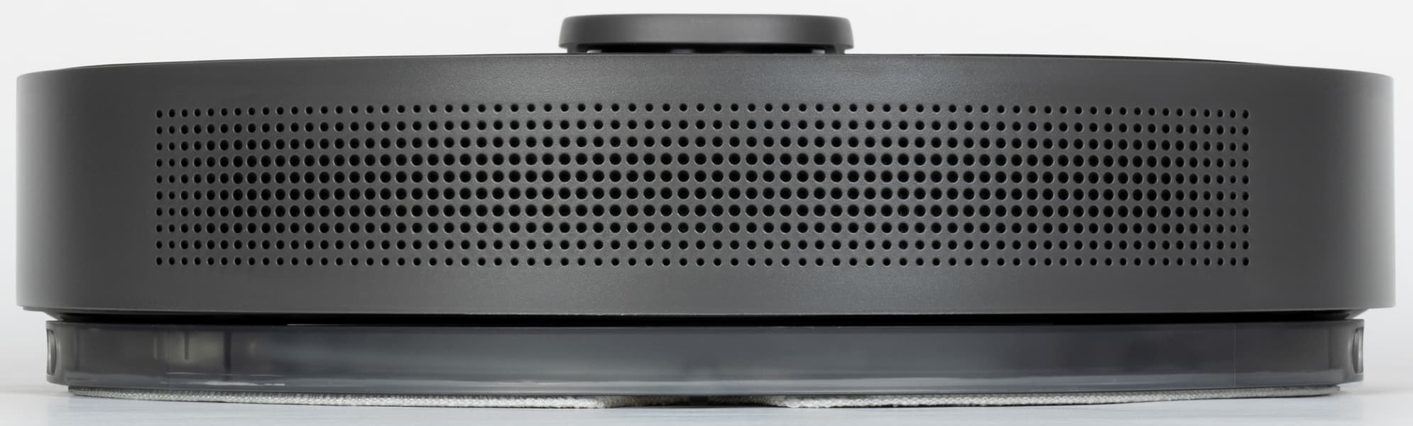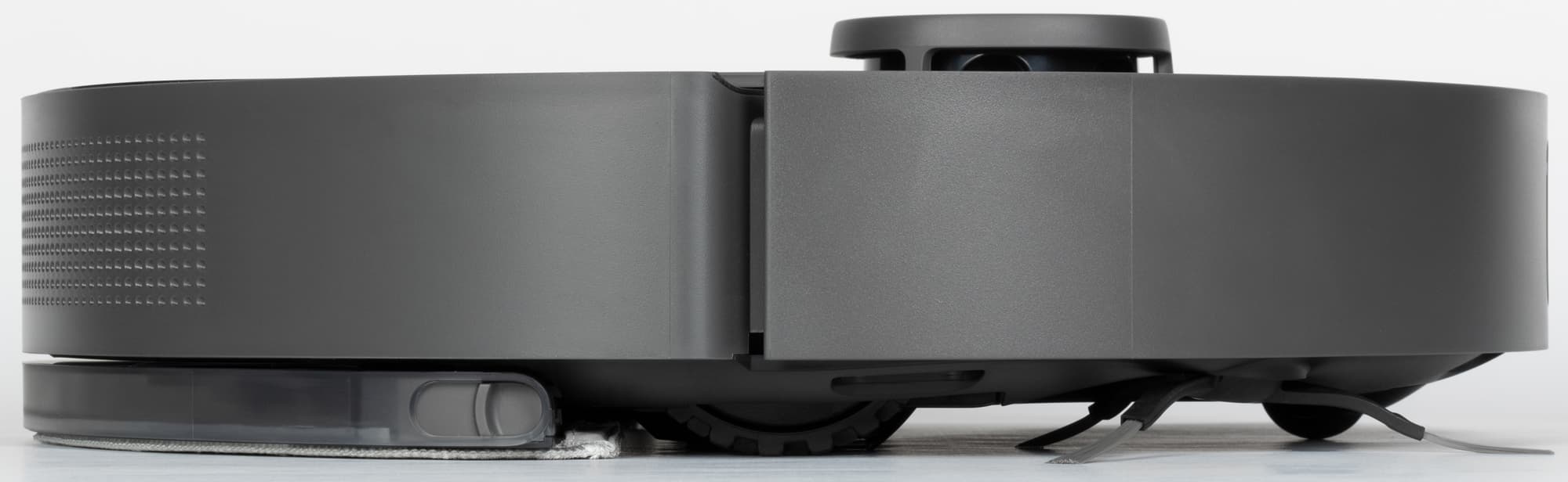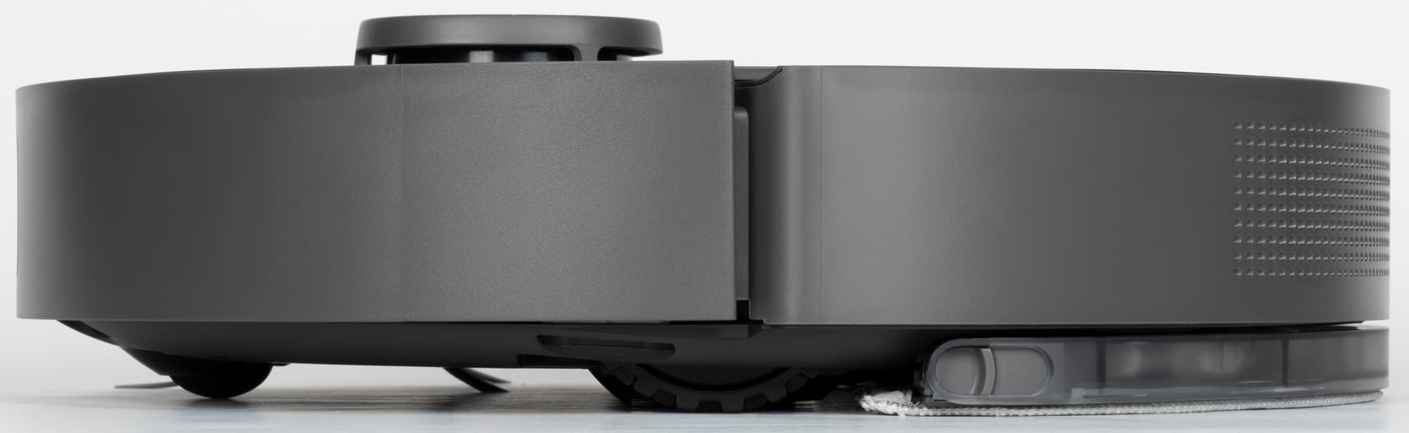 Решетка для выпуска воздуха расположена в «корме» робота, а под корпусом можно видеть насадку для влажной уборки с установленной микрофибровой салфеткой.