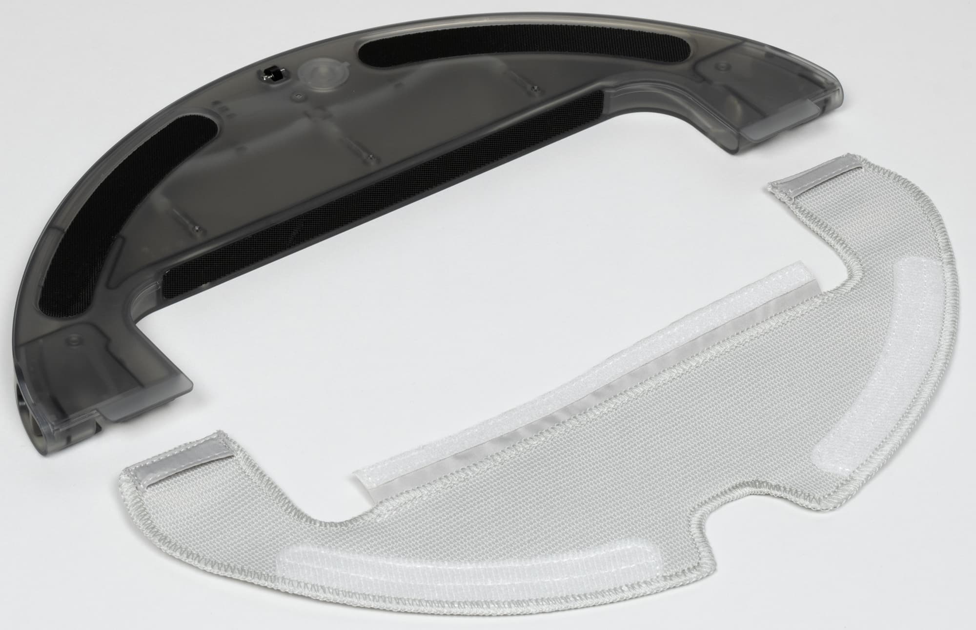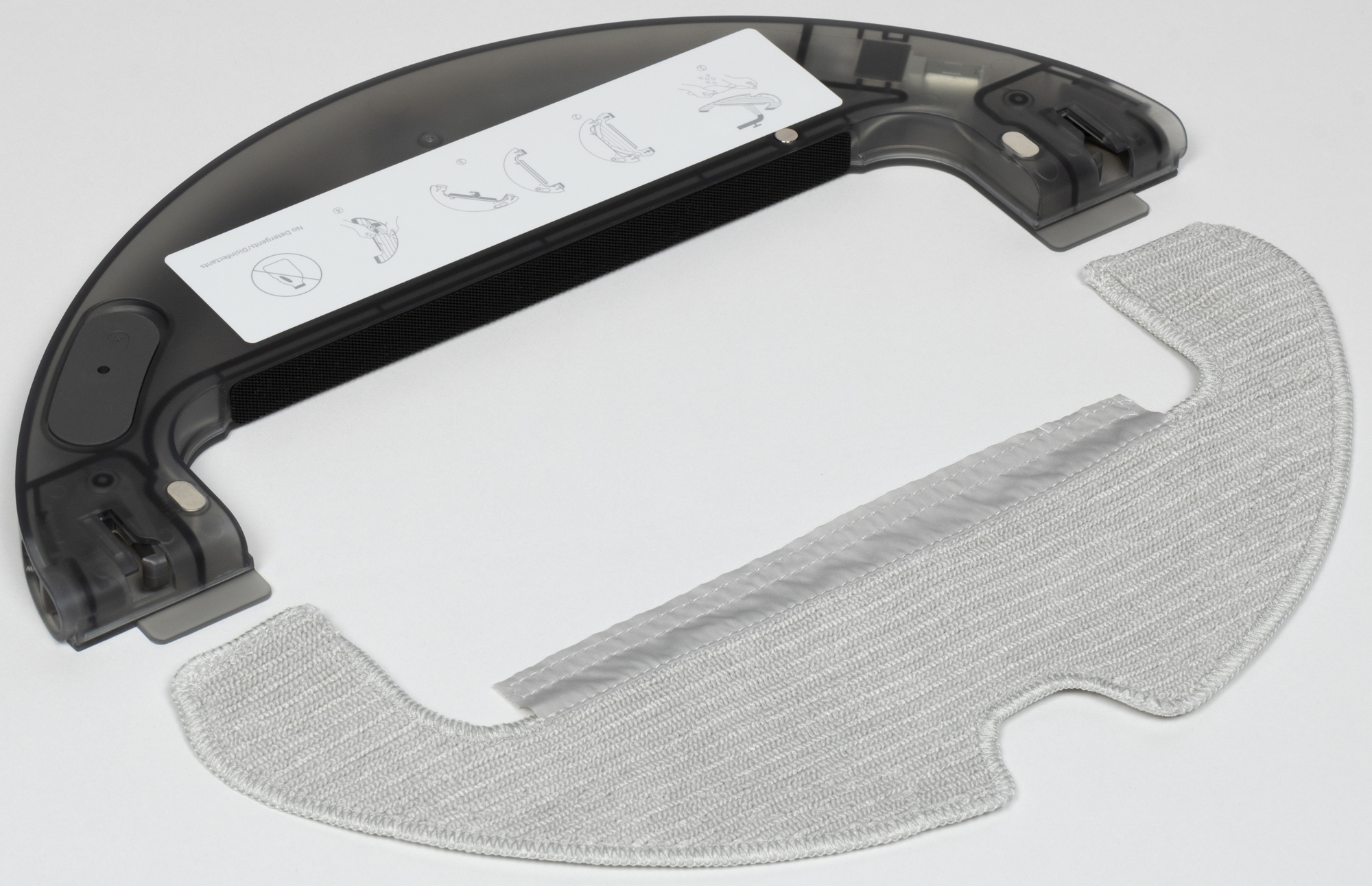 Для влажной уборки к днищу пылесоса может прикрепляться «минишвабра» состоящая из пластиковой рамки-резервуара и D-образной салфетки из серой микрофибры.
