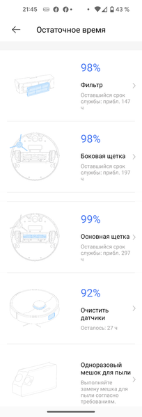 В разделе «Остаточное время» можно ознакомиться с ресурсом расходных материалов (фильтра, боковой и основной щеток) и узнать, когда наступит время для очередного обслуживания устройства.