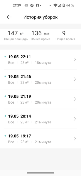 В разделе «история уборок» можно ознакомиться с журналом запусков прибора. В нем хранятся сведения о пройденной площади, продолжительности и маршруте каждой уборки.