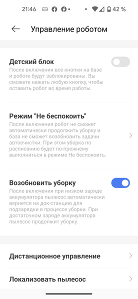 В разделе «Управление роботом» можно установить защиту от детей, заблокировав кнопки на корпусе (почему-то эта опция очень редко встречается на роботах-пылесосах), настроить режим «Не беспокоить», и заставить потерявшийся в квартире прибор подать голос.
