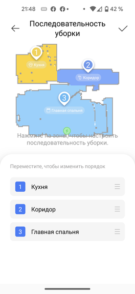 По умолчанию Dreame D10s начинает уборку квартиры с того помещения, в котором установлена база. При желании порядок уборки можно произвольно изменить, указав роботу в качестве старта, к примеру, кухню.