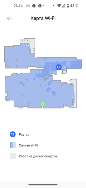 Еще одна полезнейшая особенность приложения — возможность построения карты Wi-Fi-покрытия. Во время работы робот запоминает уровень сигнала и наносит его на карту, приблизительно определяя местонахождение точки доступа. Полученные данные можно использовать для правильной ориентации антенн передатчика, чтобы исключить теневые зоны, в которых пылесос может потерять сигнал.