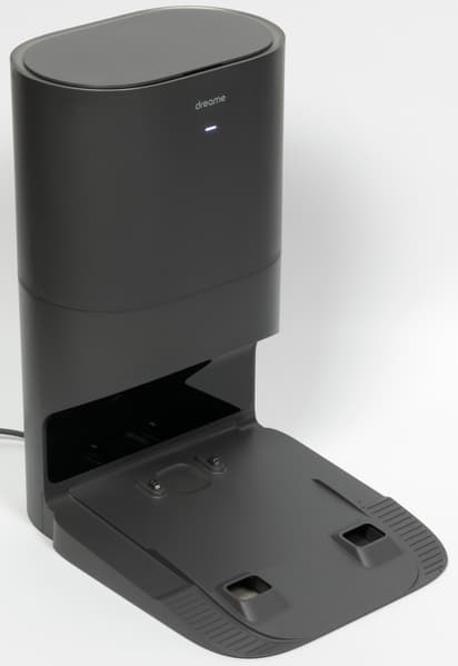 Базовая станция оборудована большой консолью, на которую робот самостоятельно въезжает. На ней можно видеть два контакта для зарядки и пару отверстий, через которых происходит самоочистка: входное и выходное.