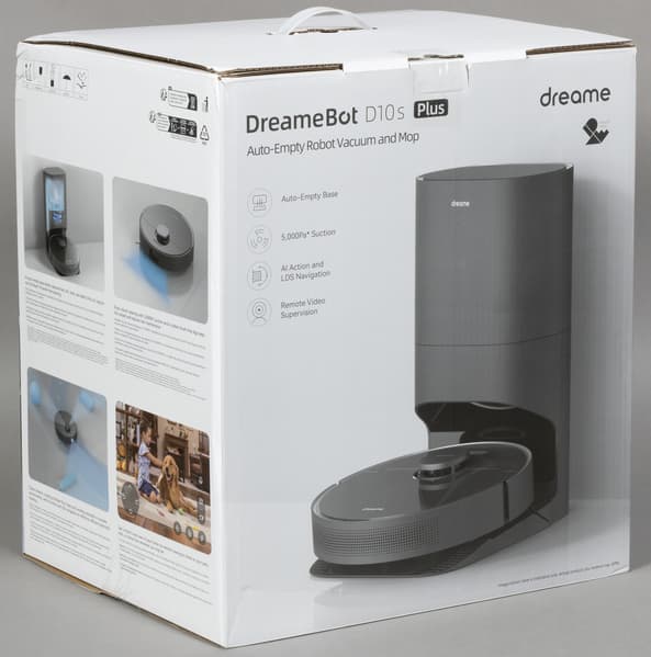 Пылесос поставляется в белой картонной коробке с полноцветной печатью. На ее передней стороне размещено изображение робота, стоящего на базе, и перечислены основные особенности модели: автоматическая очистка мусоросборника, давление всасывания 5000 Па, навигация с помощью LDS-сенсора и искусственного интеллекта и удаленное наблюдение за прибором с помощью встроенной камеры.