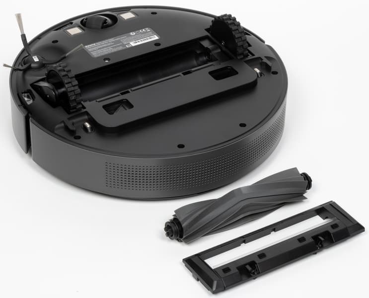 У центральной щетки нет привычных рядов щетины: только мягкие V-образные ламели в шесть рядов. Как это скажется на эффективности подметания, мы выясним чуть позже, во время практического тестирования. Рамка щетки — без каких-либо приспособлений, защищающих от наматывания на ротор проводов и других посторонних предметов.