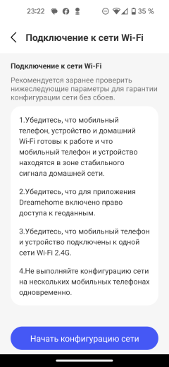 Процесс сопряжения активируется одновременным нажатием на кнопки «Power» и «Home». После этого приложение запрашивает SSID и пароль от нашей домашней сети. Передача сетевых настроек занимает около минуты и успешно завершается без каких-либо затруднений.