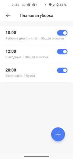 Самая важная функция для домашнего робота — возможность гибкой настройки уборки по расписанию. У Dreame D10s с этим все в порядке: для каждой задачи мы можем установить время выполнения, день недели и тип уборки.
