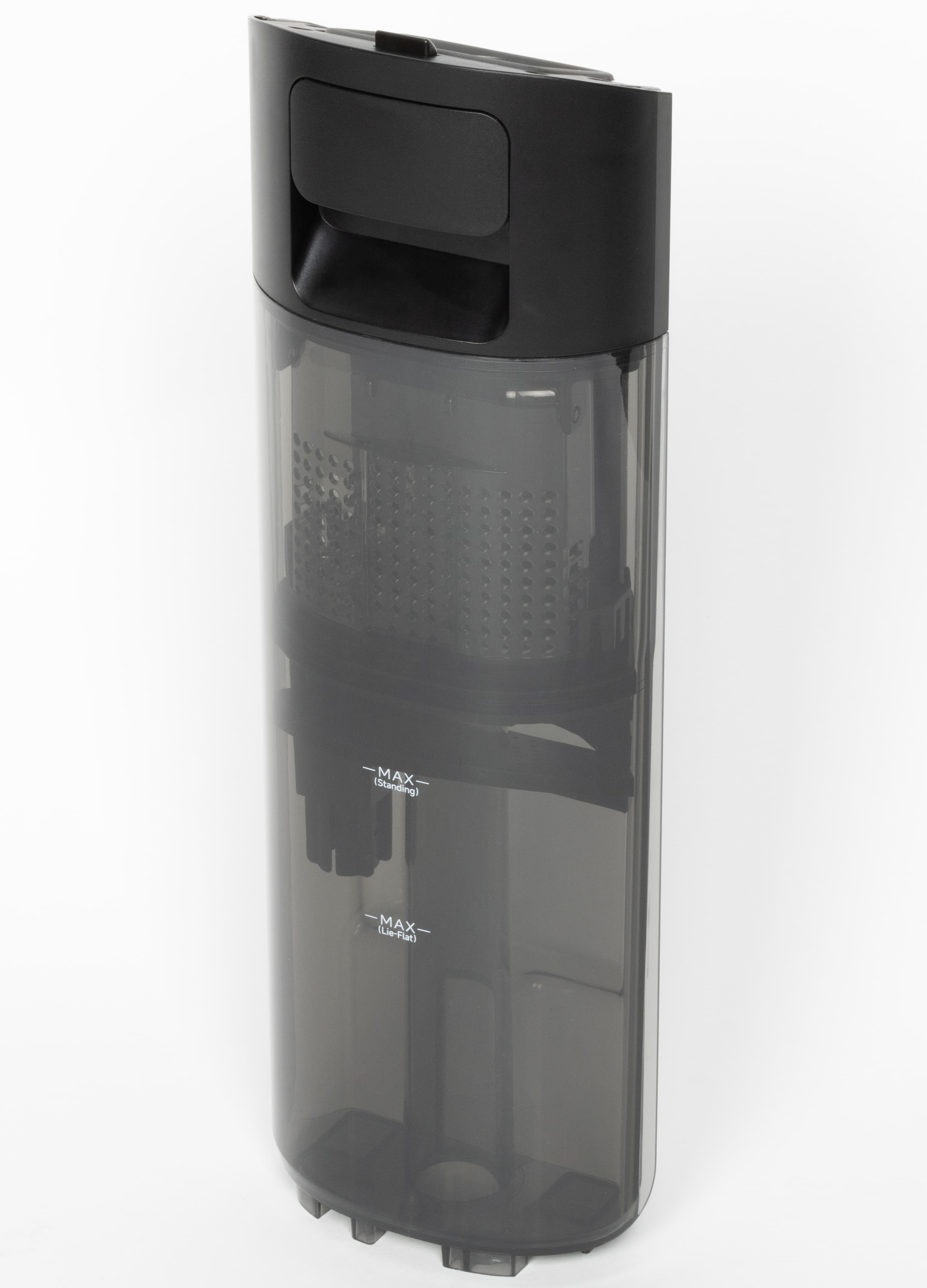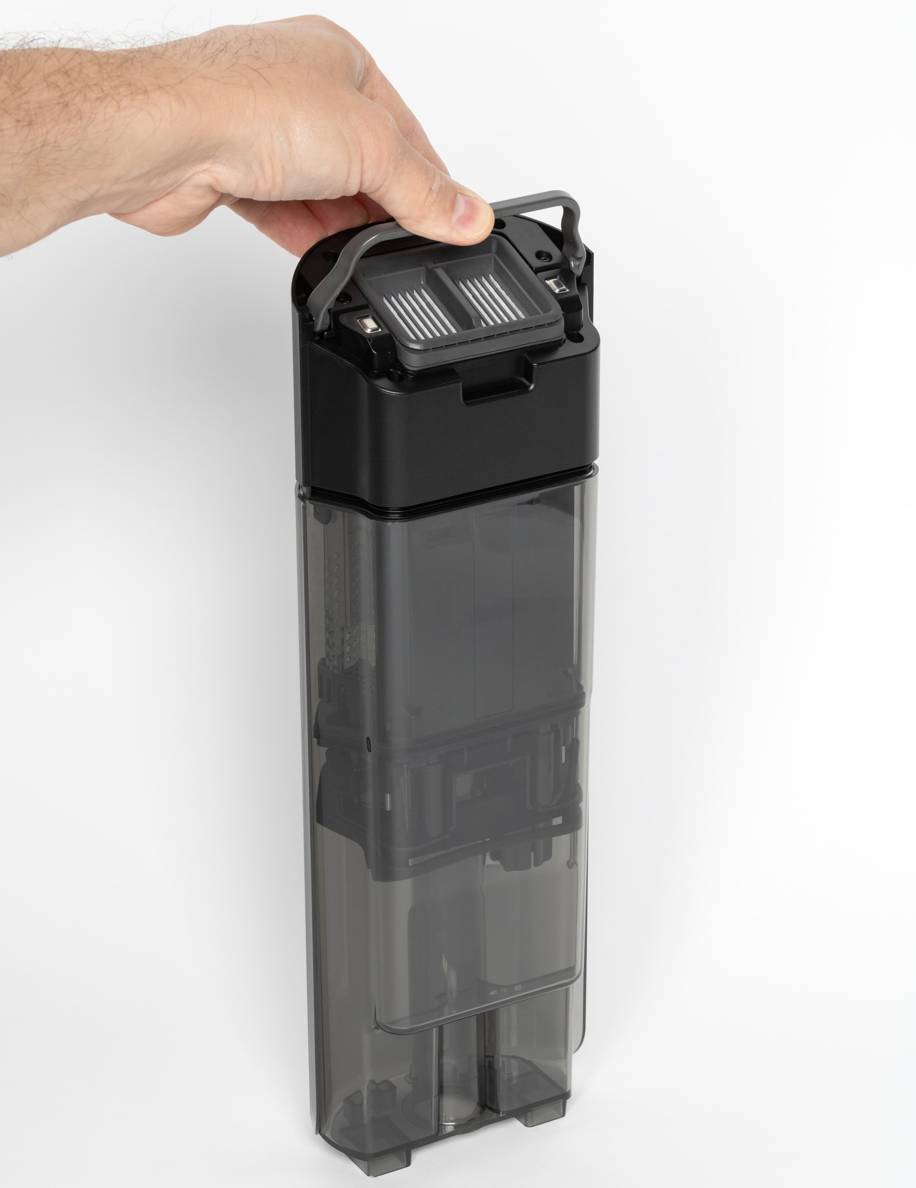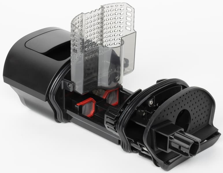 Стенки резервуара позволяют визуально контролировать уровень грязной воды в баке, но практической необходимости в этом, как правило, нет: по достижении максимального уровня пылесос прекращает работу и требует очистить мусоросборник. Точно так же приходит оповещение и о необходимости долить чистую воду. В «горизонтальном» режиме опустошать бак с грязной водой придется чаще: максимальный объем воды составит 400 мл (против 650 мл в вертикальном режиме).