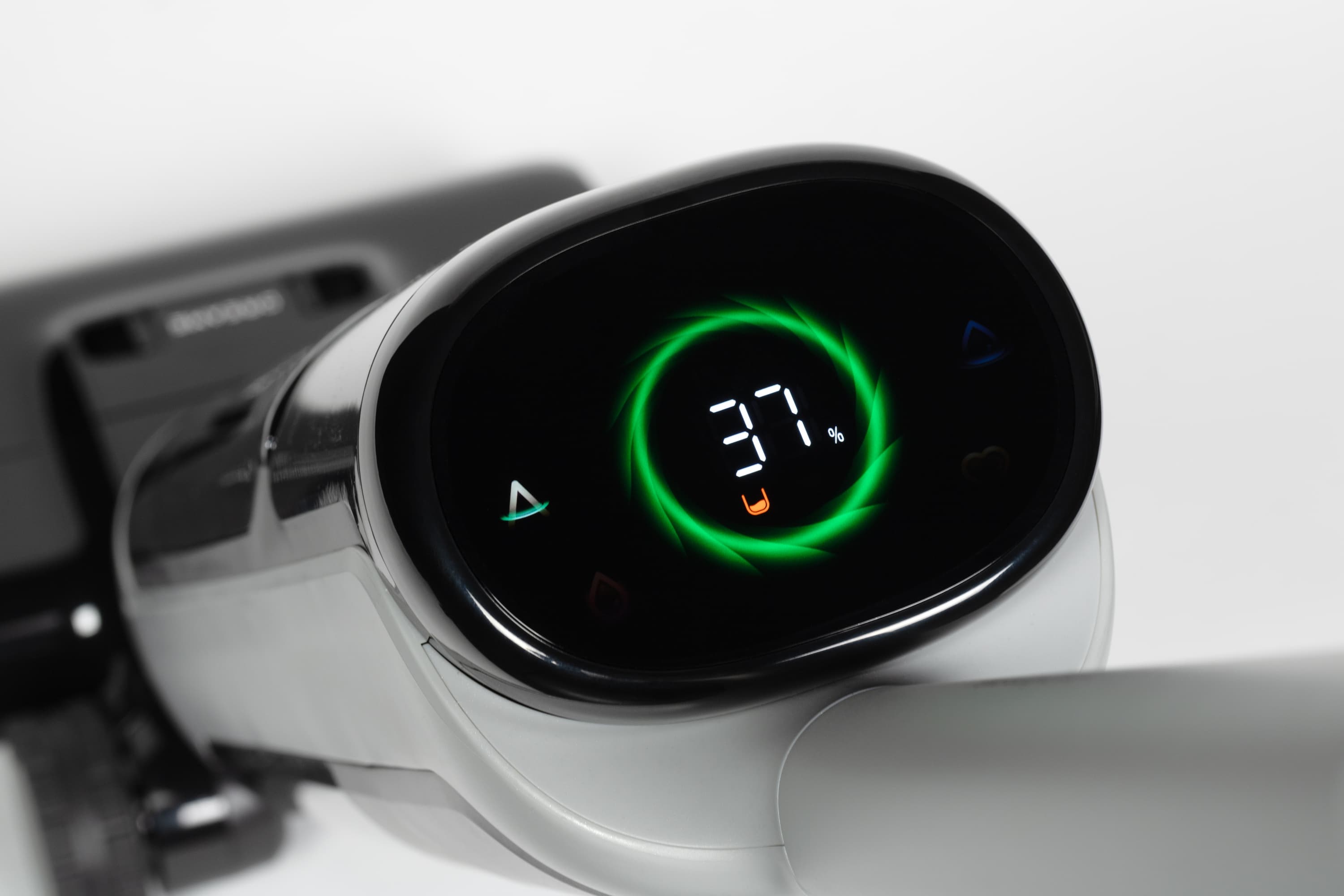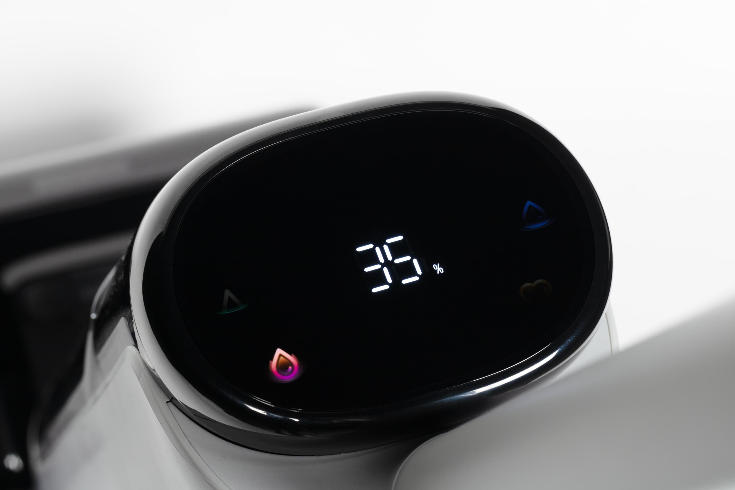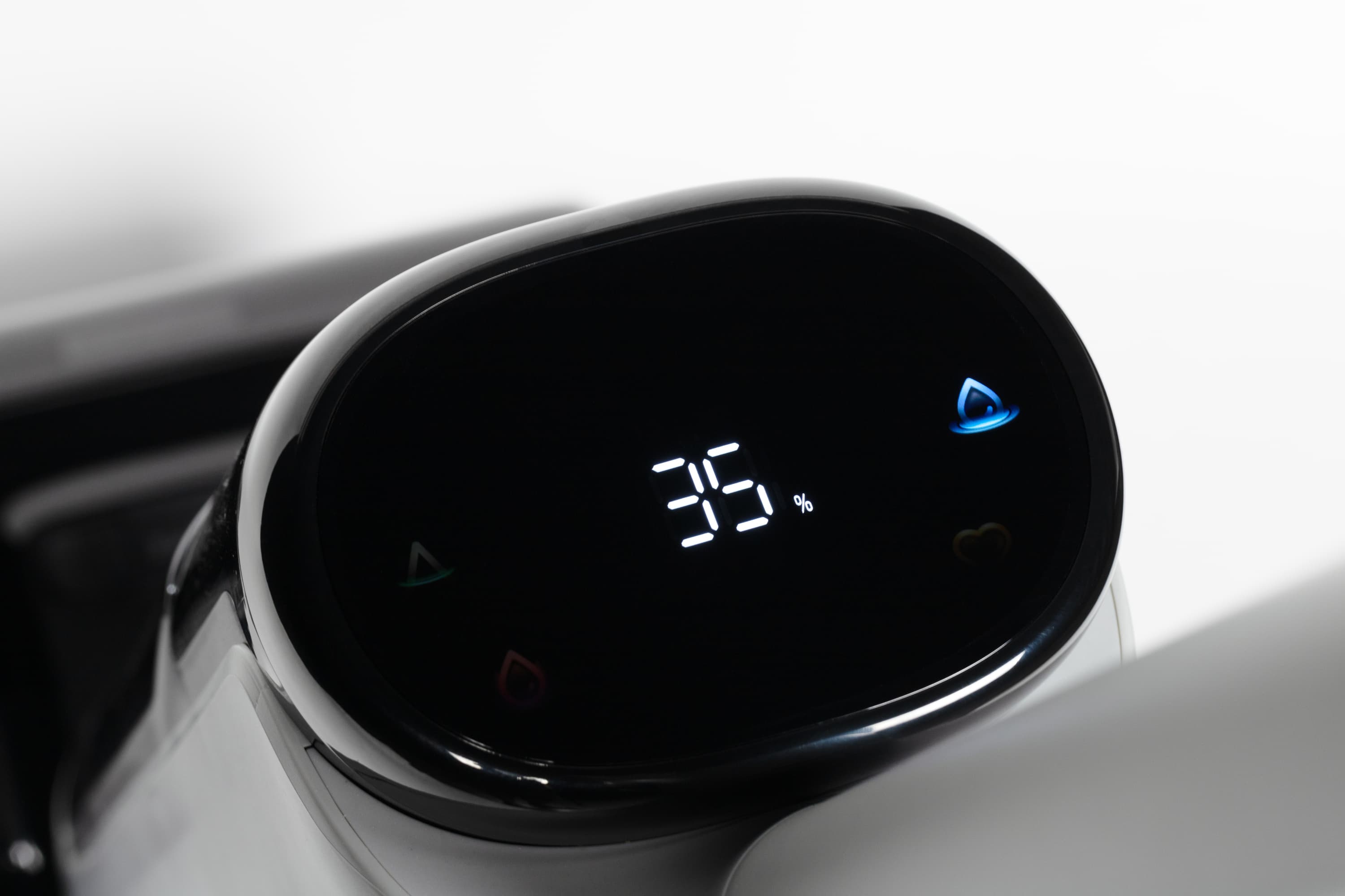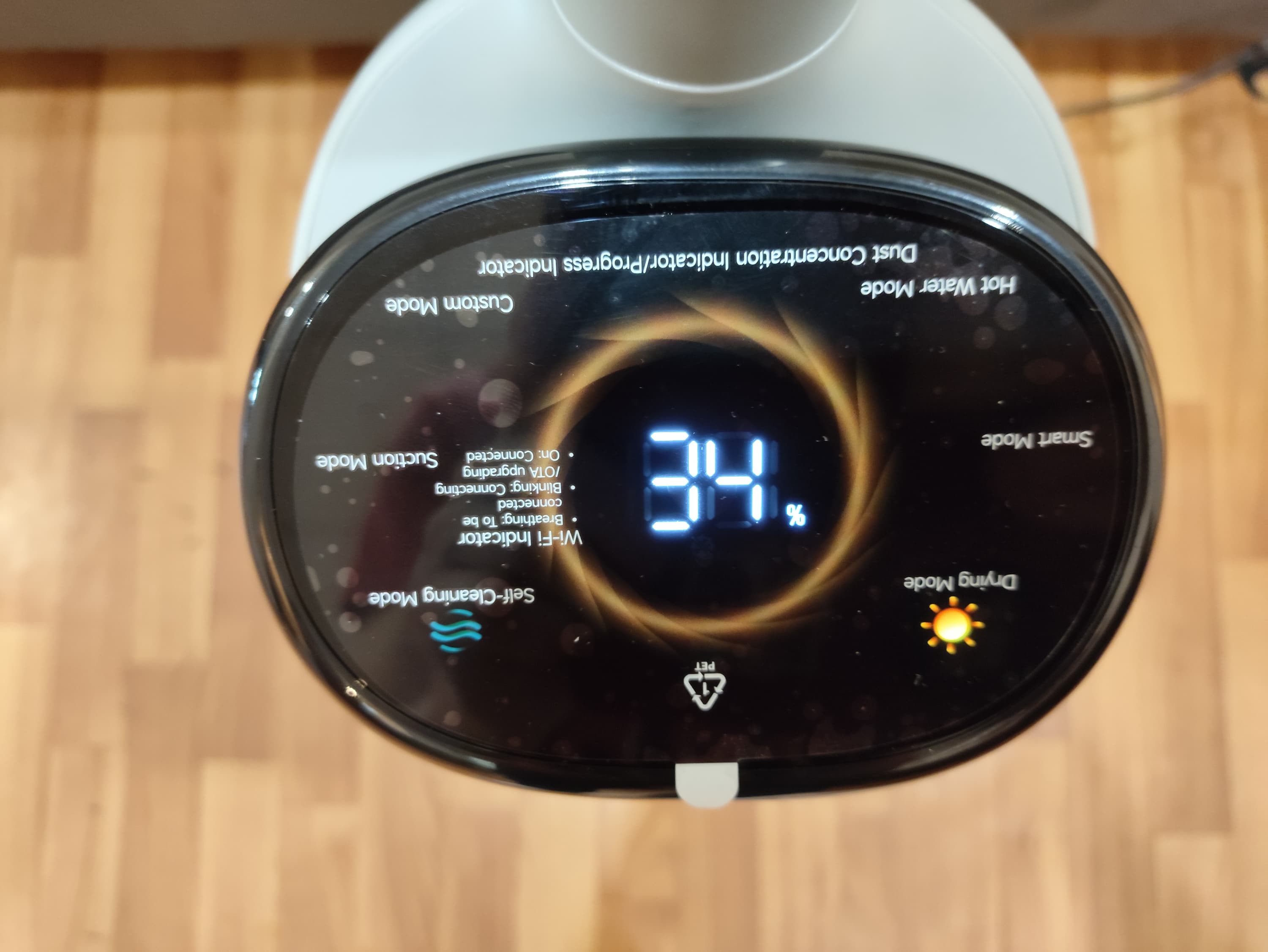Отметим, что индикация заряда и иконки расположены «вверх ногами» друг относительно друга. Почему так? Для удобства. Потому что во время работы и во время зарядки мы смотрим на пылесос с разных сторон.