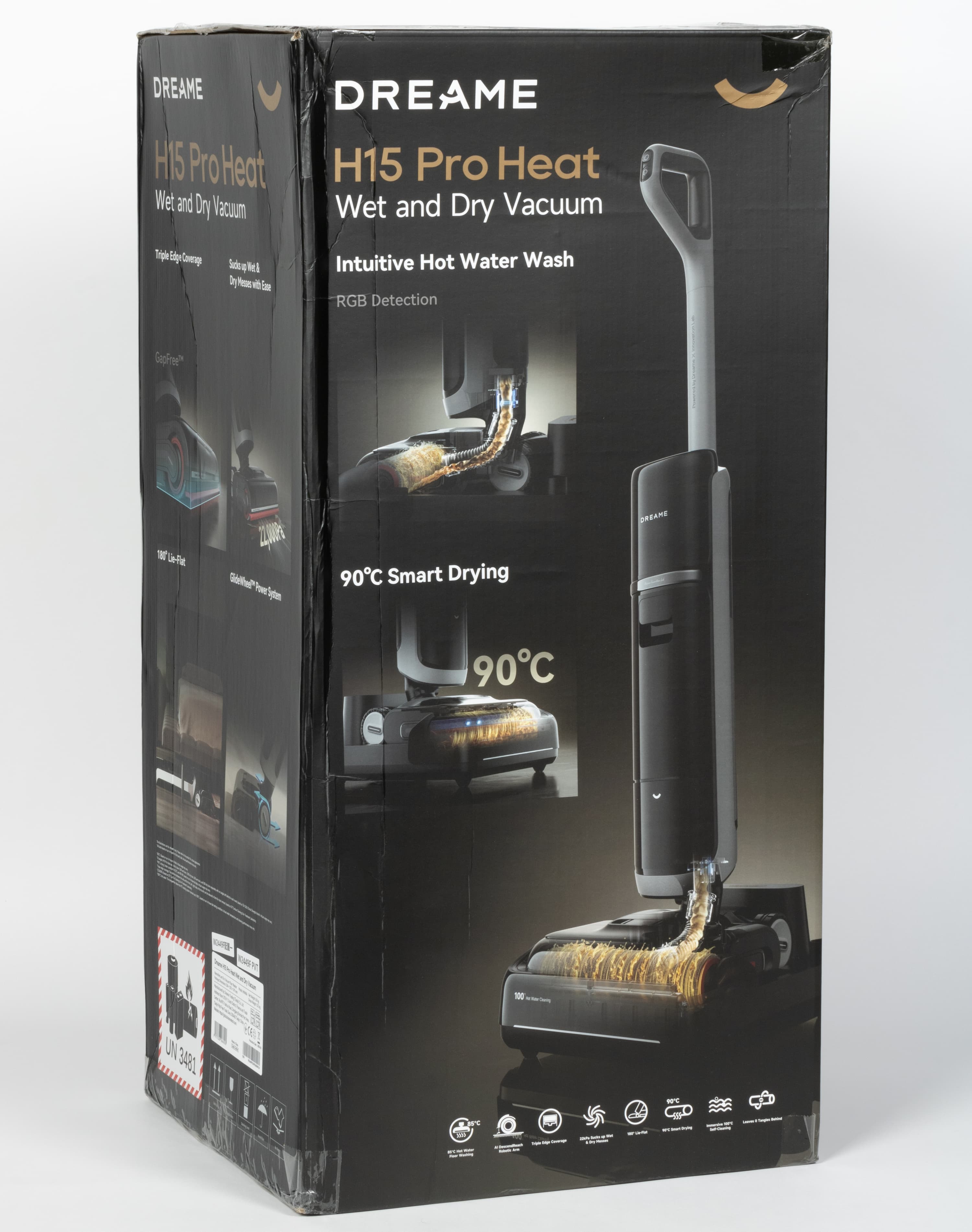 Внутри — парадная глянцевая коробка с полноцветной печатью. На лицевой стороне мы видим фотографию пылесоса, а также упоминание ключевых особенностей модели — мойка теплой водой, а также автоматическая сушка при 90 градусах.