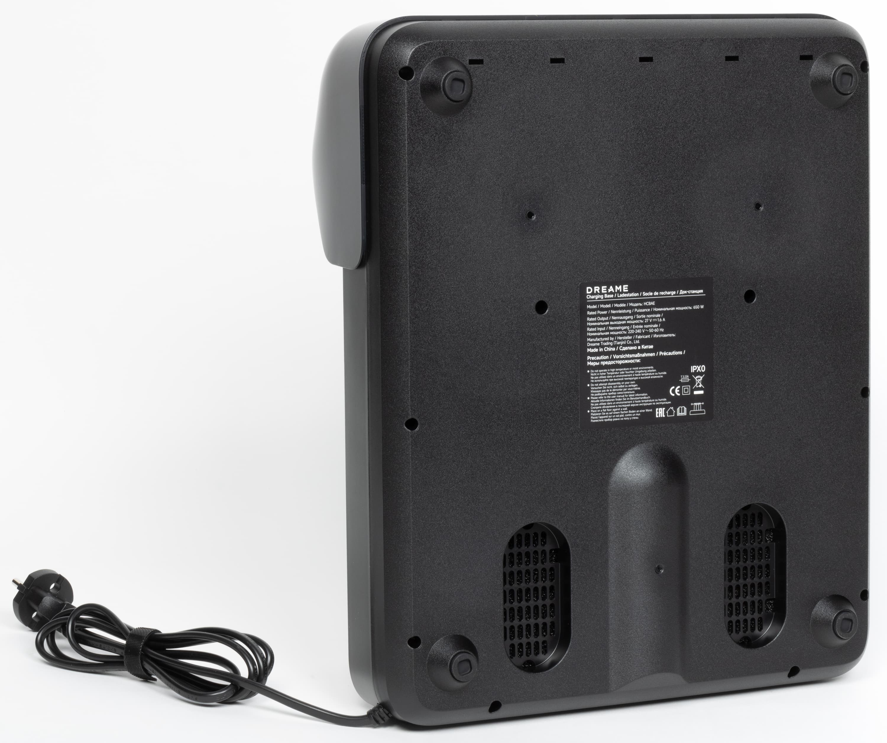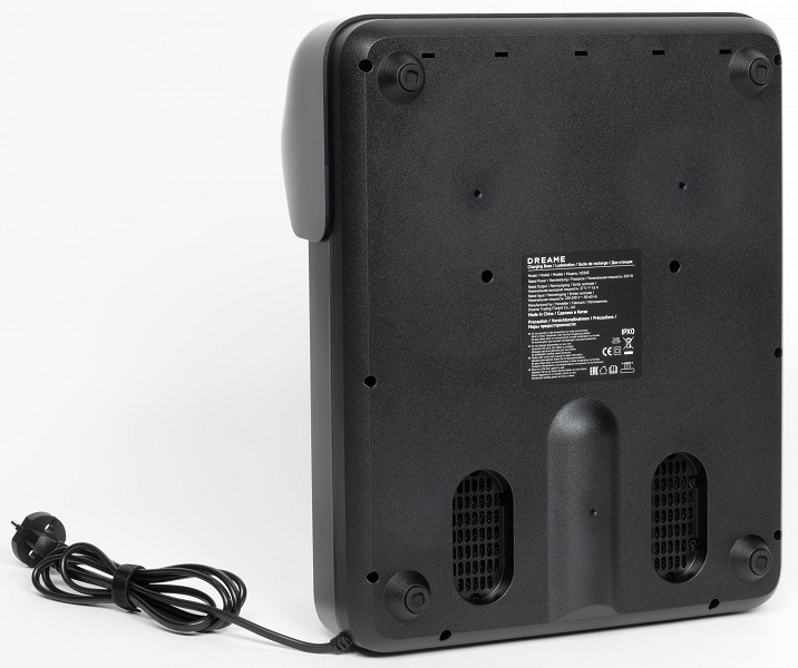 С нижней стороны базы мы видим антискользящие ножки, решетки для выпуска воздуха, а также наклейку с технической информацией о модели.