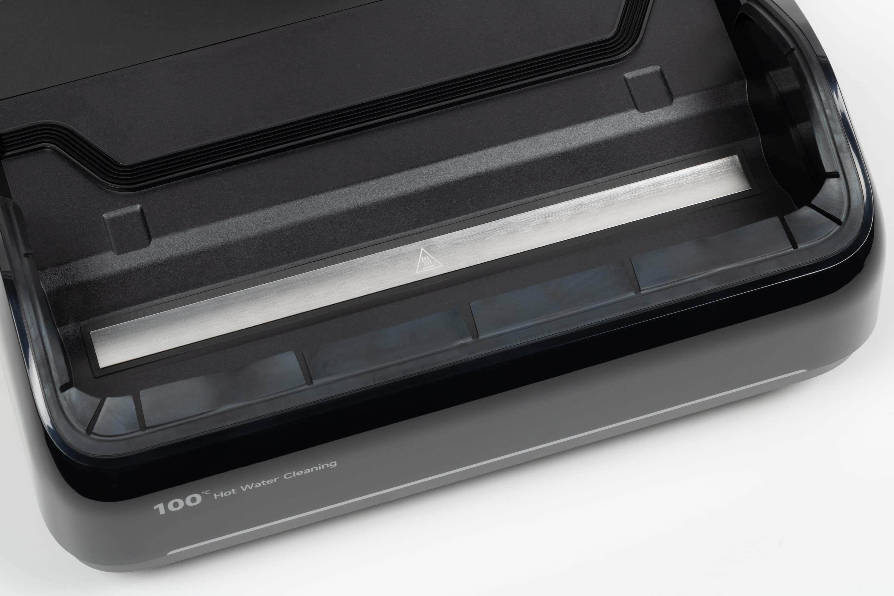 Передняя часть базы имеет ряд резиновых лепестков, защищающих окружающее пространство от случайных брызг. Также на передней стороне базы мы видим упоминание того, что при самоочистке температура воды достигает максимальных 100 градусов.