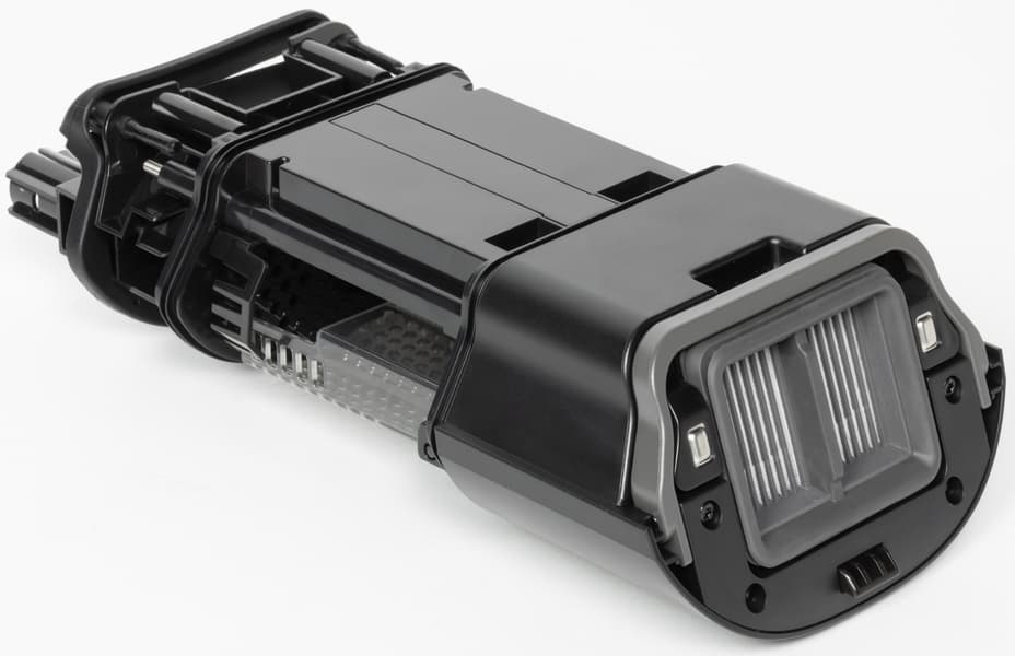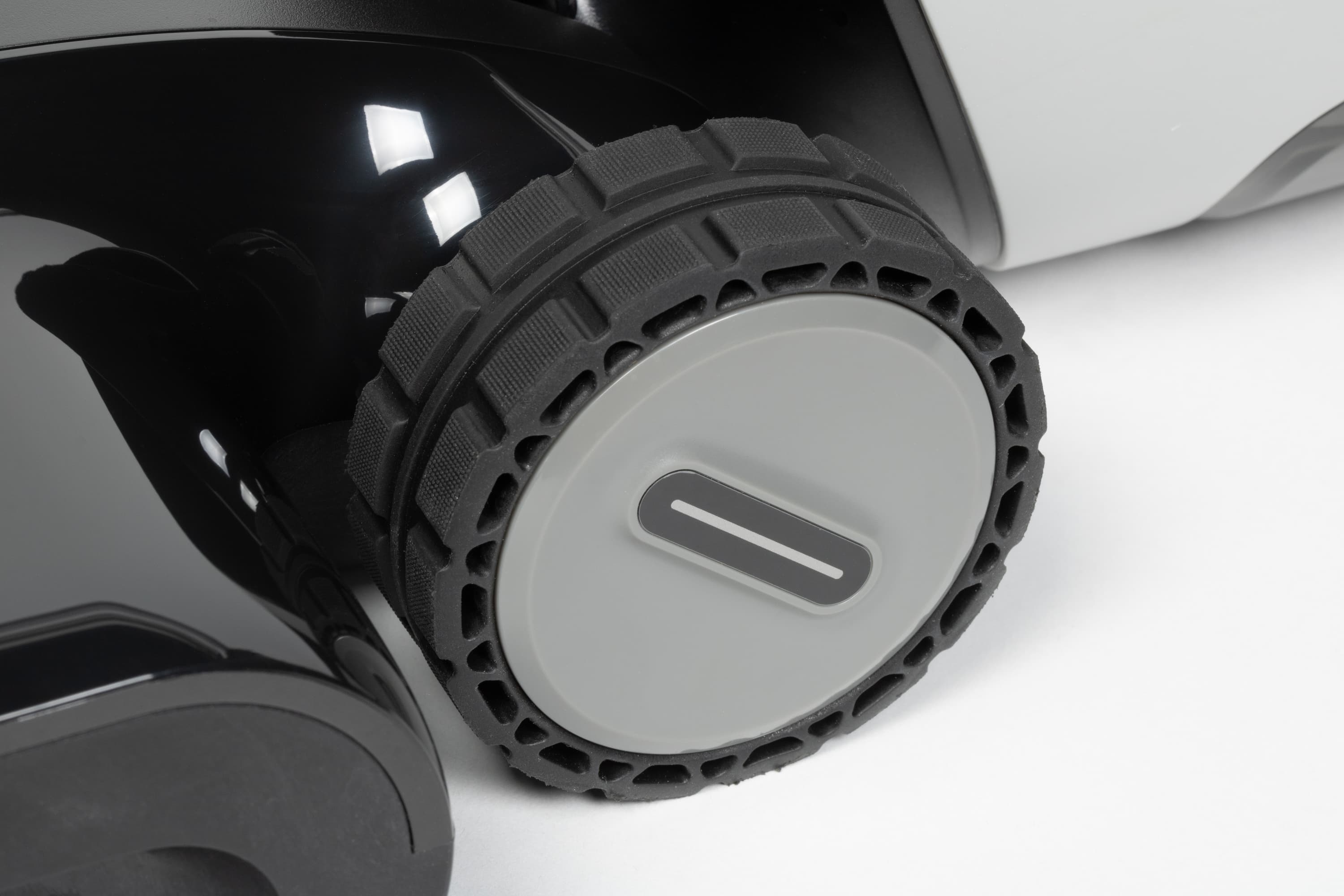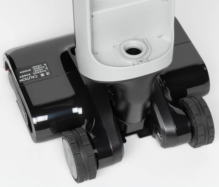 Опирается пылесос на два моторизированных крупных колеса в пяточной части насадки. Благодаря встроенному мотору колеса будут автоматически «подруливать» в сторону движения пылесоса, тем самым помогая пользователю перемещать довольно тяжелый корпус.