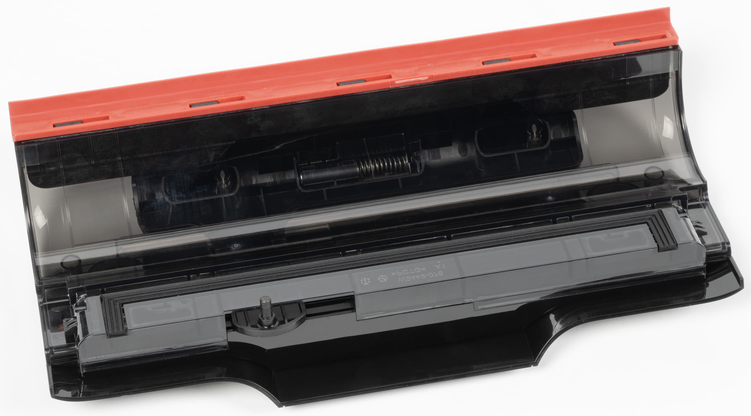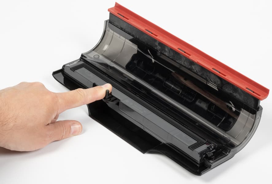 А перед роллером мы видим красную автоматическую шторку, которая выполняет роль дополнительного скребка при «обратном ходе» (то есть, когда мы тянем пылесос на себя). При движении от себя шторка поднимается и в уборке не участвует.