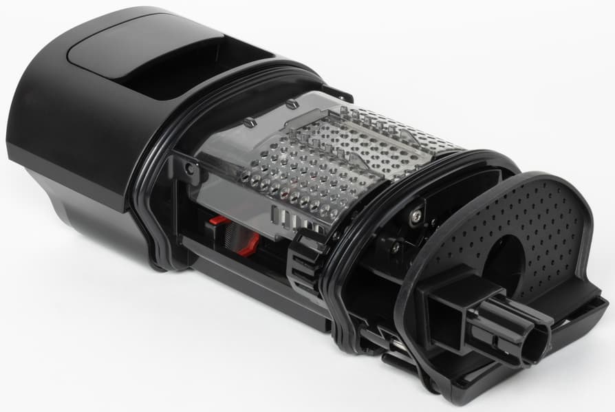 Внутри у него имеется система фильтрации, состоящая из нескольких ступеней. А с внешней стороны мы видим две отметки, соответствующие максимально допустимому уровню грязной воды — для вертикальной и горизонтальной уборки соответственно.