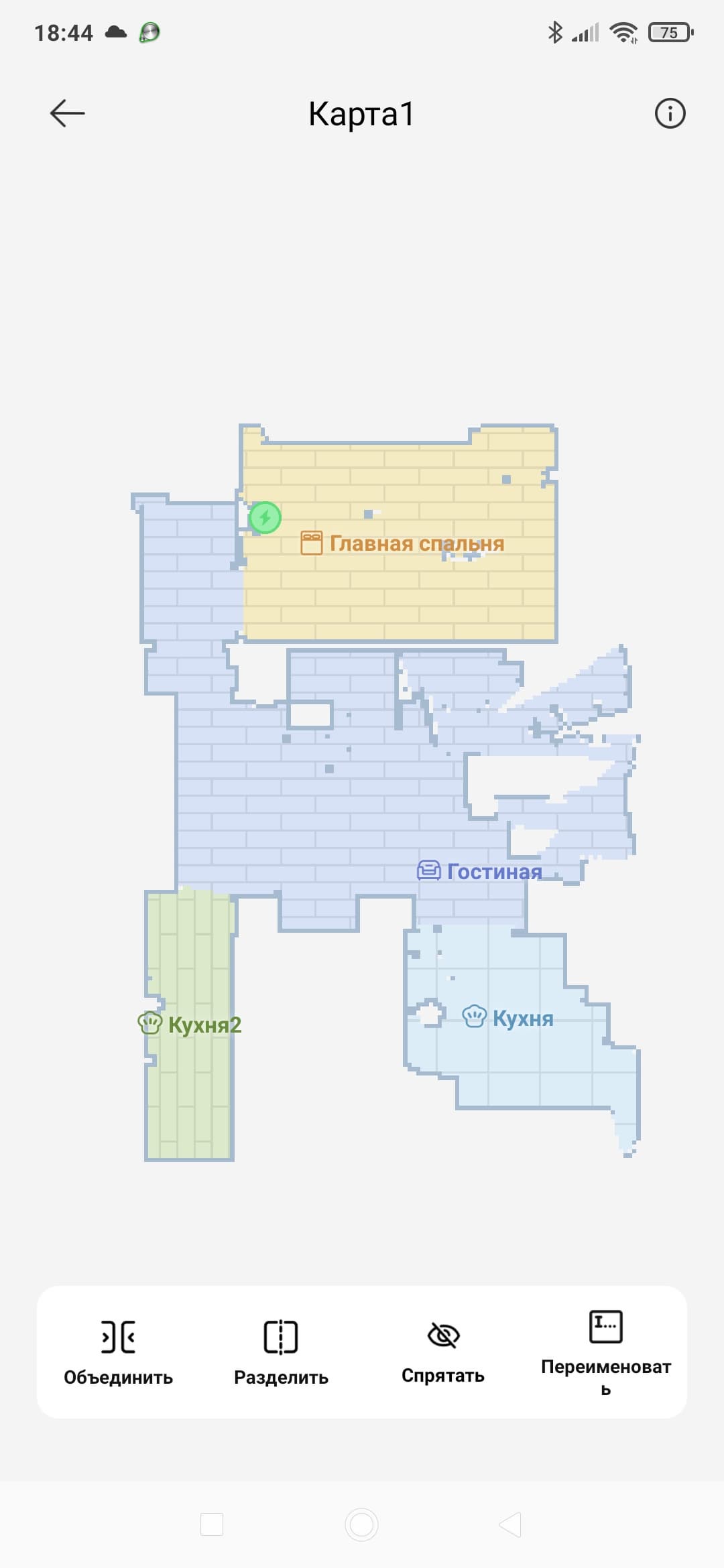 Комнатам присваиваются названия. Тут робот может немного ошибиться (в нашем случае он принял часть коридора за вторую кухню), однако основную кухню он при этом определил правильно. Уж не знаем, как ему это удается. Подозреваем, что камера робота «увидела» холодильник, других версий у нас нет.