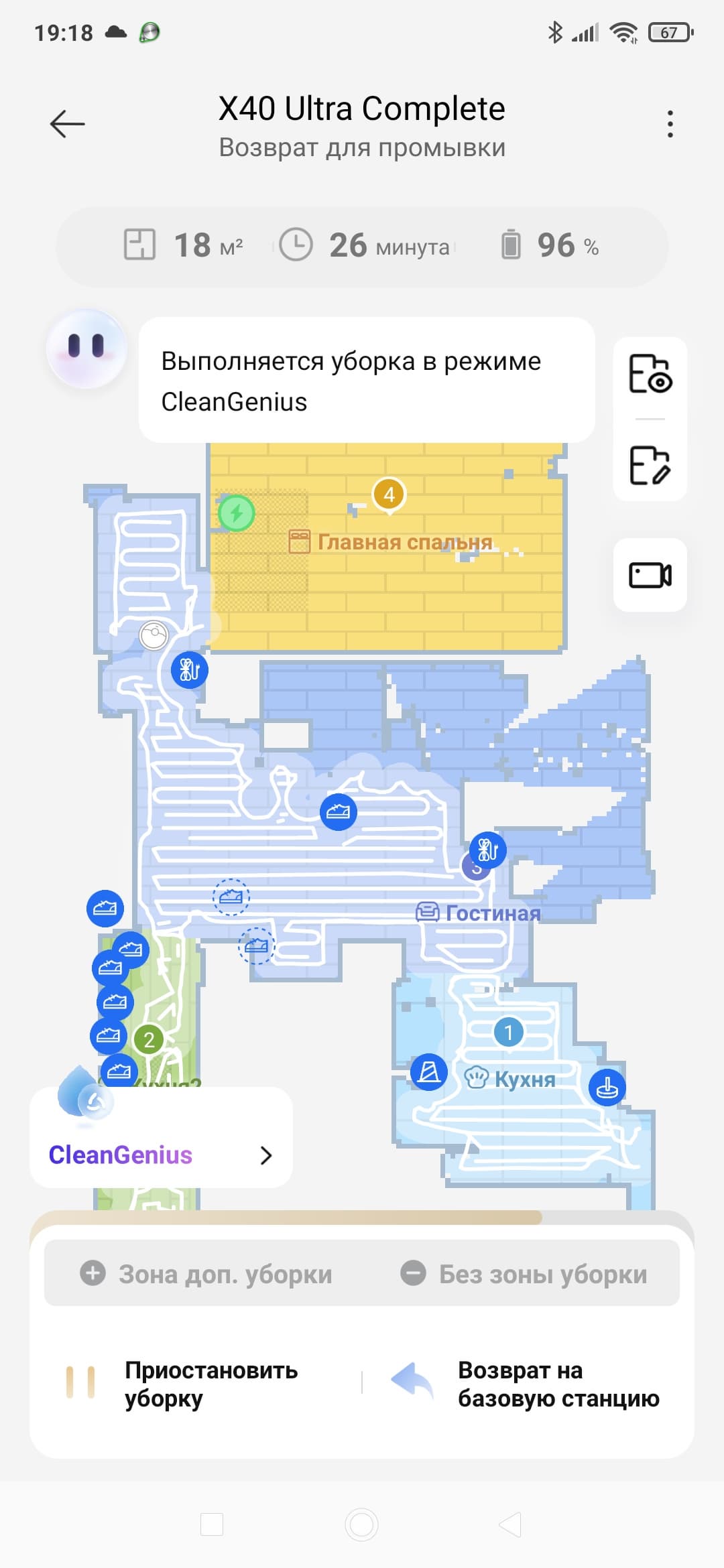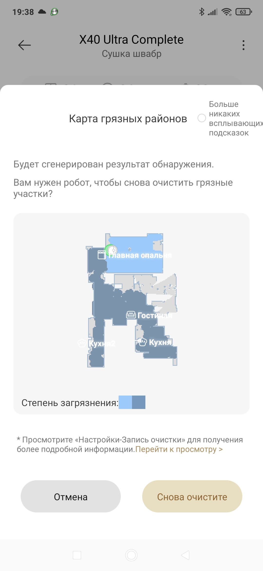 По завершении работы на карте появятся зоны с повышенным загрязнением. «Карта грязных районов» позволит повторно очистить некоторые участки квартиры.