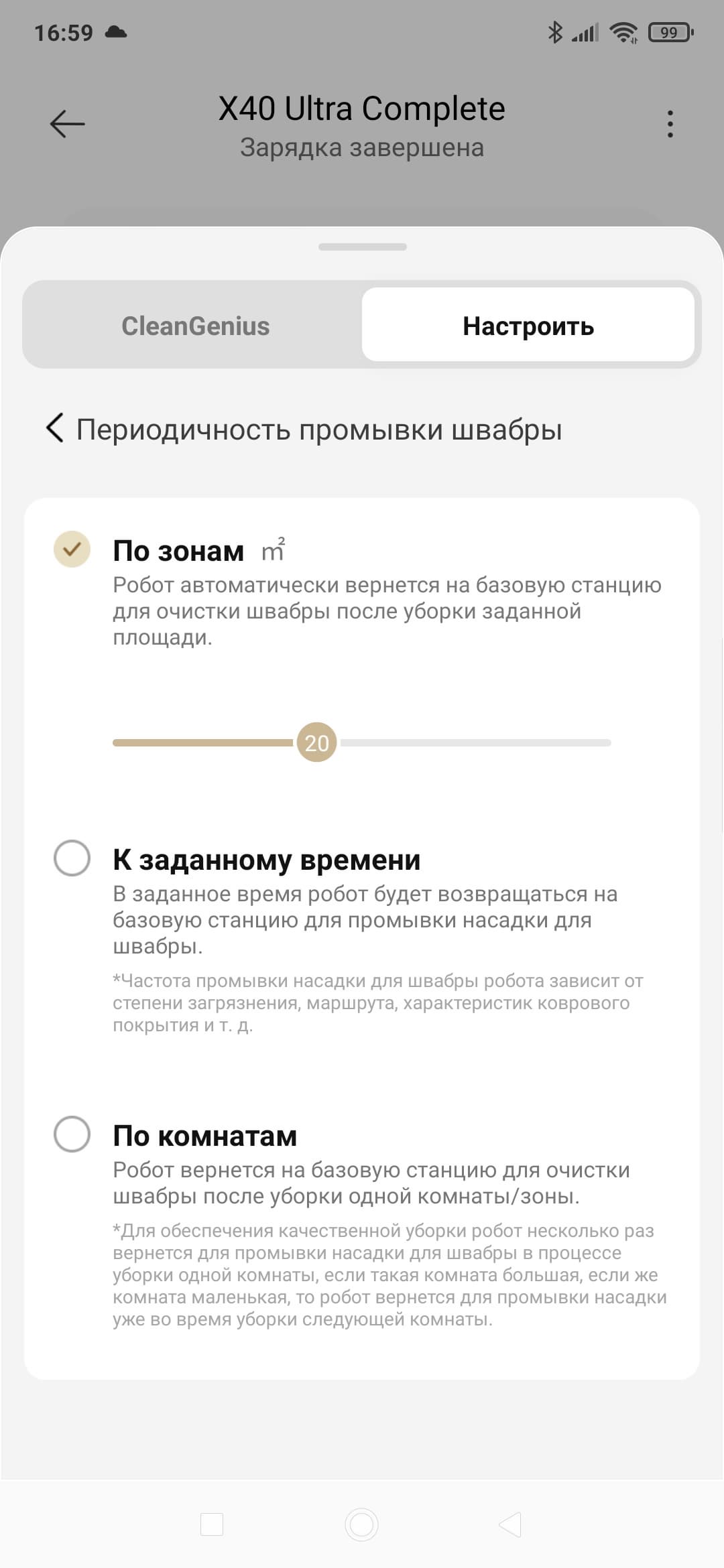 Настройки базы также довольно гибкие. Нас тут в первую очередь интересует промывка швабры. Ее мы можем очищать в различных режимах. Например, через каждые 20 квадратных метров убранной площади. Или после каждой комнаты.