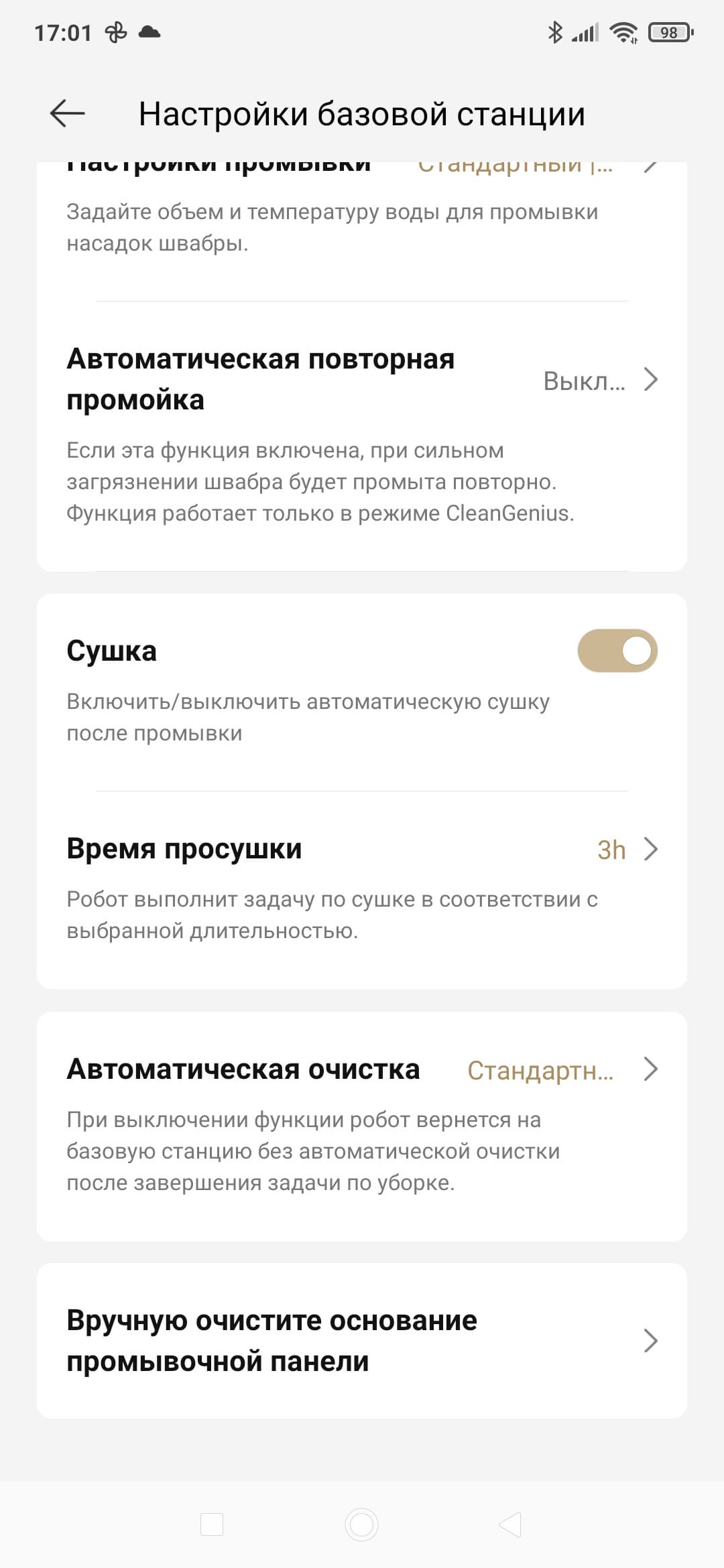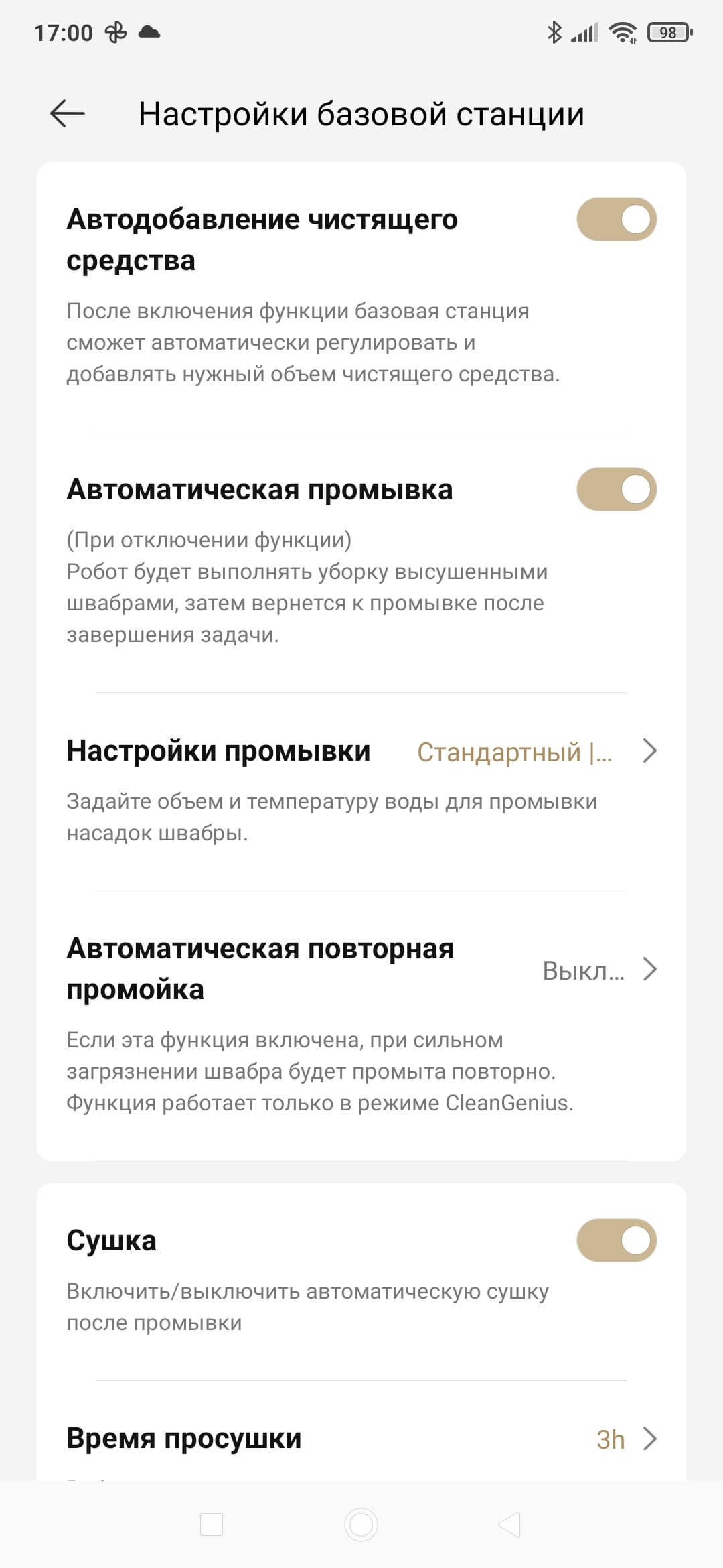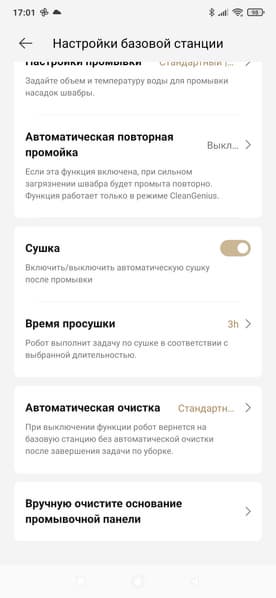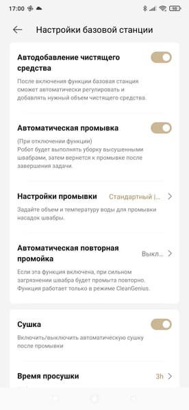 Для базовой станции мы можем настроить параметры промывки, включить или отключить мойку горячей водой, настроить длительность сушки швабры, а также указать периодичность опустошения контейнера для мусора.