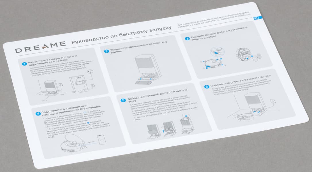 Правила эксплуатации данной модели практически ничем не отличаются от того, что мы видели в младших роботах Dreame. Перед началом эксплуатации пылесос и базу следует освободить от упаковочных материалов и наклеек, не забыв вынуть мягкие транспортировочные прокладки между корпусом робота и подвижным бампером.