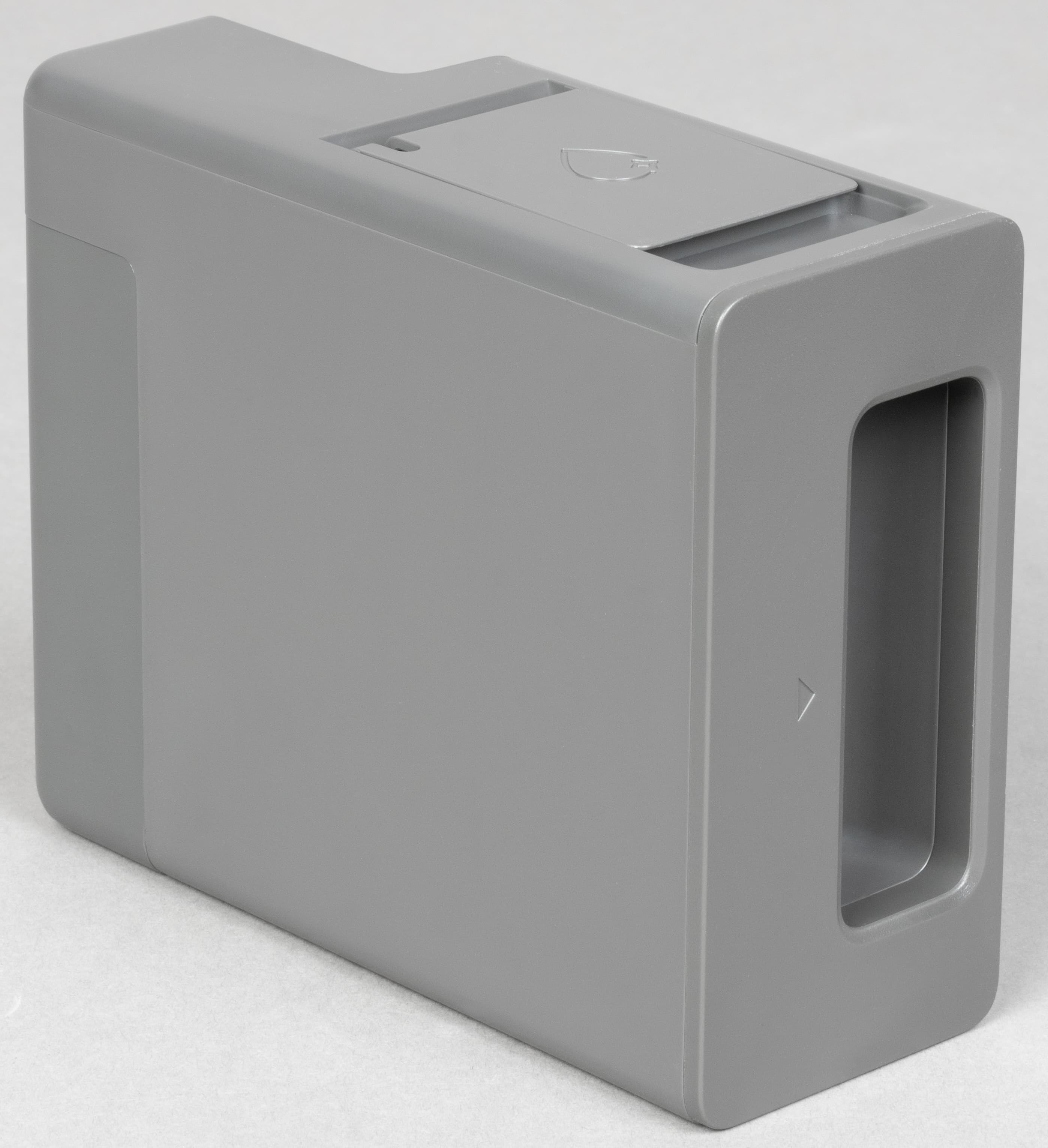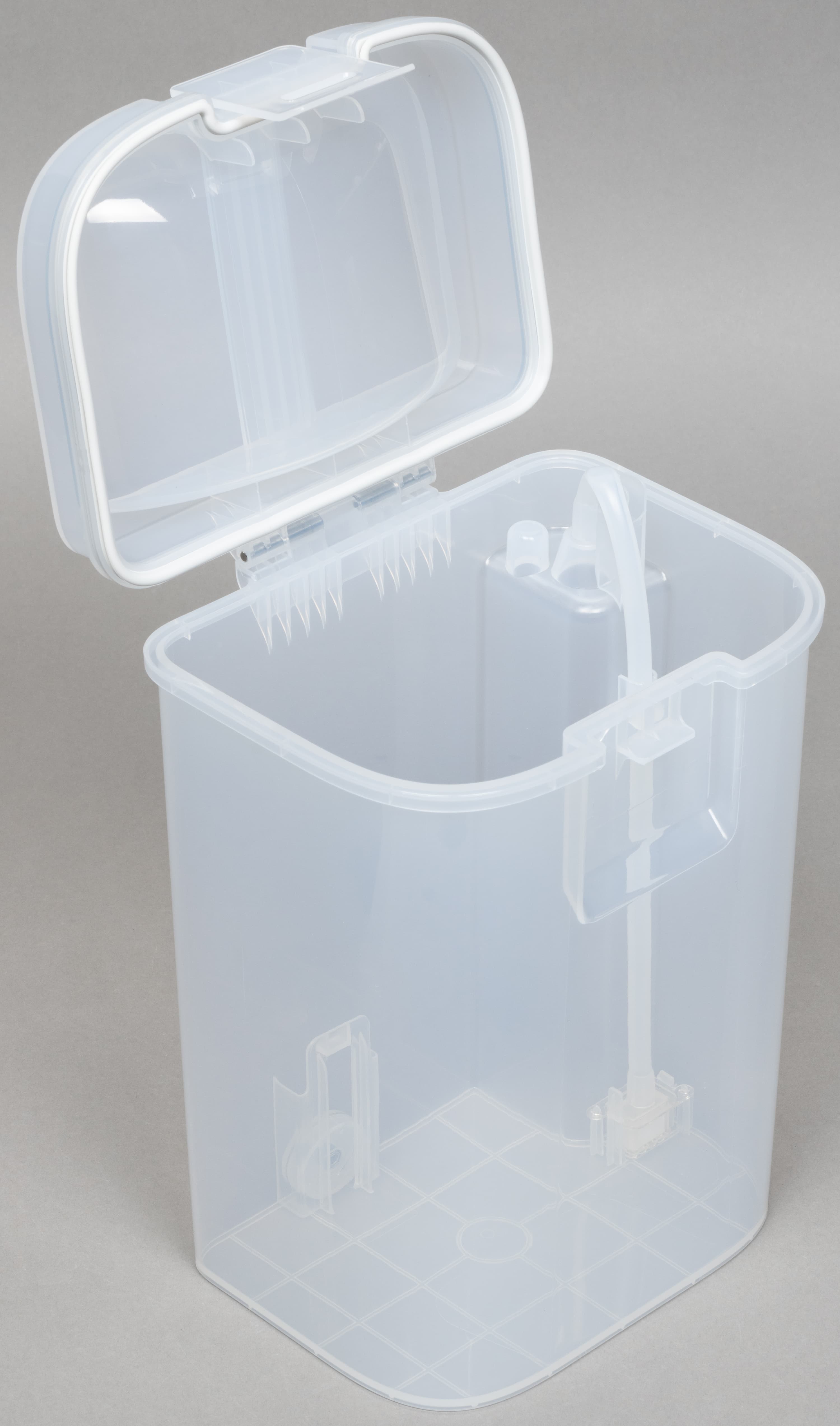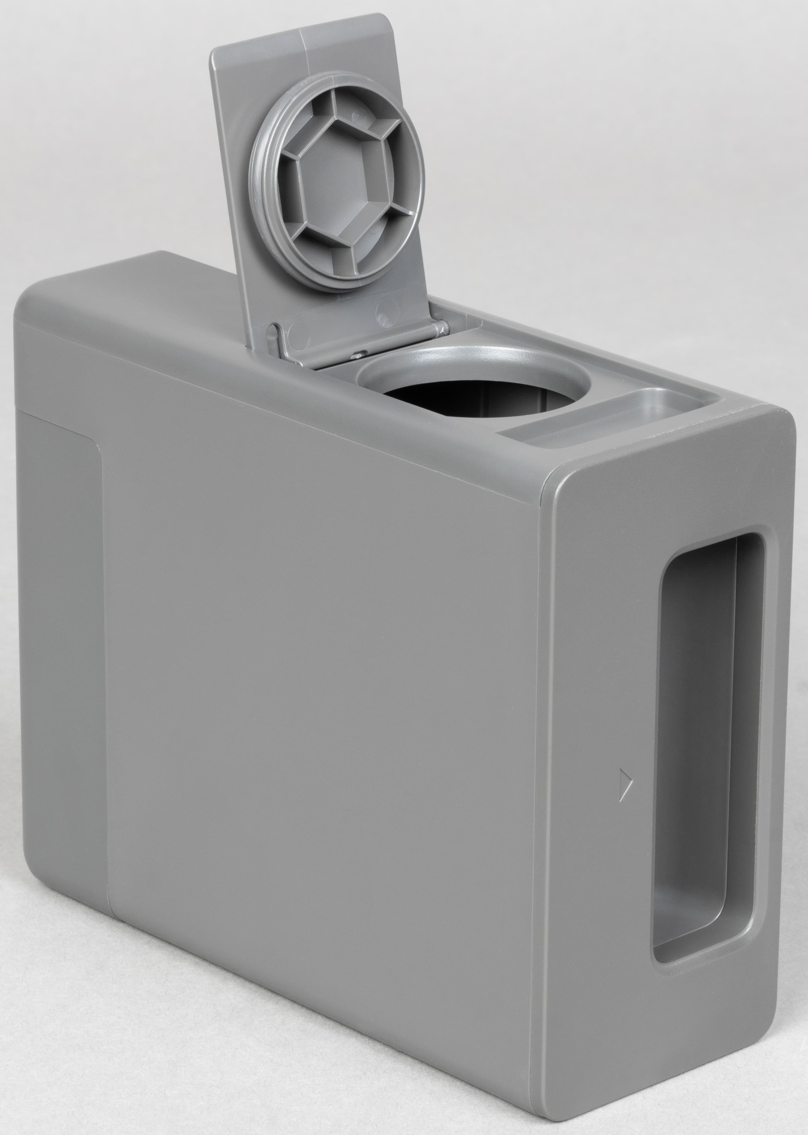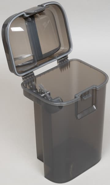 Контейнер сделан из полупрозрачного серого пластика.