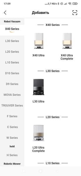 Для начала синхронизации мы можем воспользоваться ссылкой «Добавить устройство» и выбрать нашу модель из недлинного списка поддерживаемых роботов, а можем просто отсканировать QR-код на корпусе прибора (это потребует разрешения на доступ к камере смартфона).