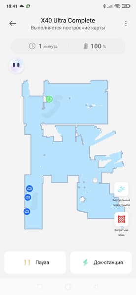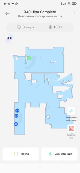 Мы представляем результаты тестирования устройства по нашей методике, подробно описанной в отдельной статье. Перед началом тестов мы позволили пылесосу несколько минут погулять по полигону, чтобы ознакомиться с планом помещения и конфигурацией препятствий, после чего запустили тестовую уборку.