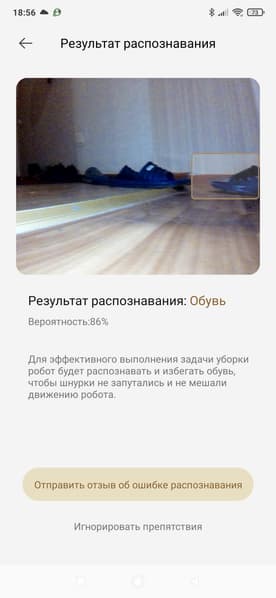 Скажем, пожалуй, пару слов про работу с камерой. Во-первых, искусственный интеллект робота позволяет распознавать препятствия. При этом мешающий объект будет сфотографирован (в кадр могут попасть и люди, так что этот режим можно отключить).