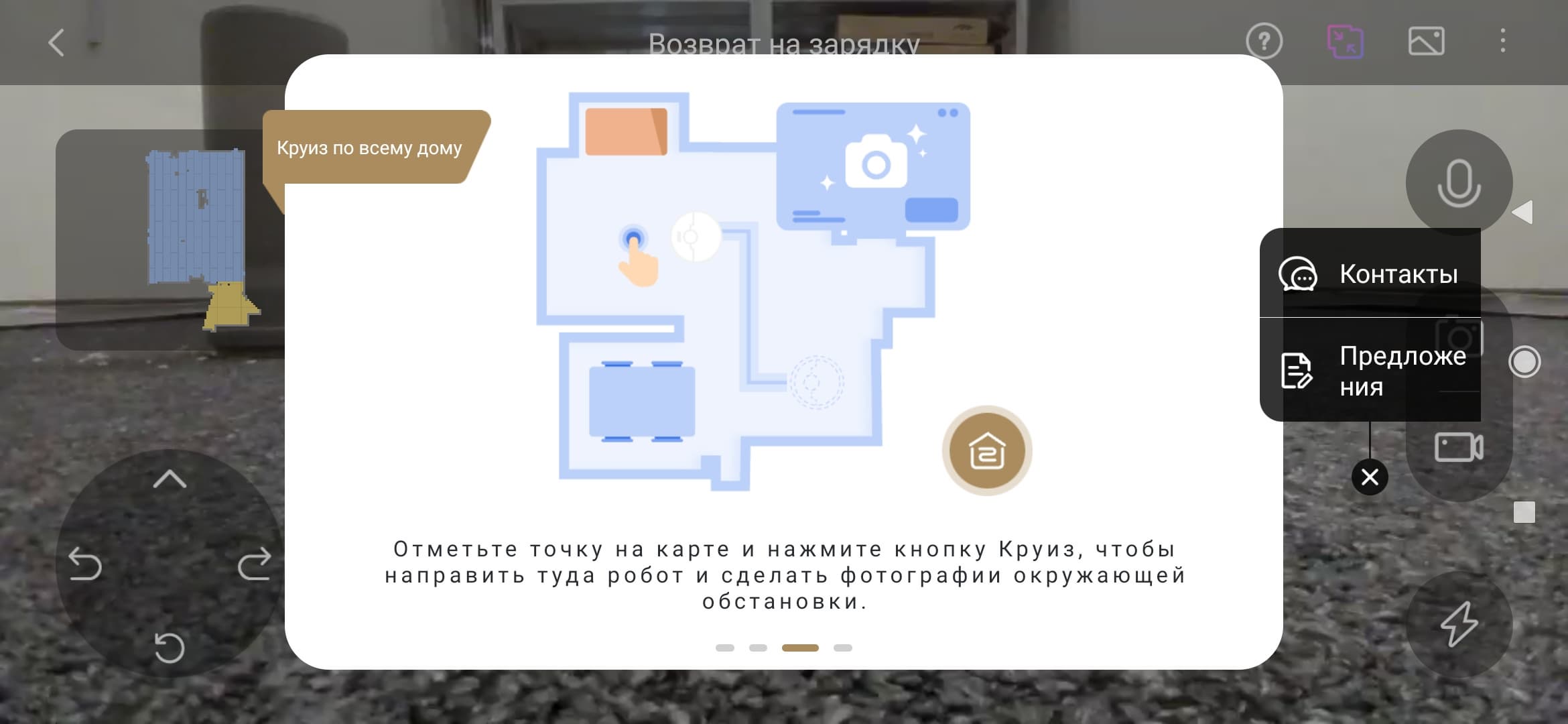 С помощью пункта «Дистанционное управление» можно превратить экран приложения в пульт ДУ, позволяющий направить робота в нужную точку квартиры. Но значительно увлекательнее делать это из главного меню, управляя пылесосом с включенной камерой.