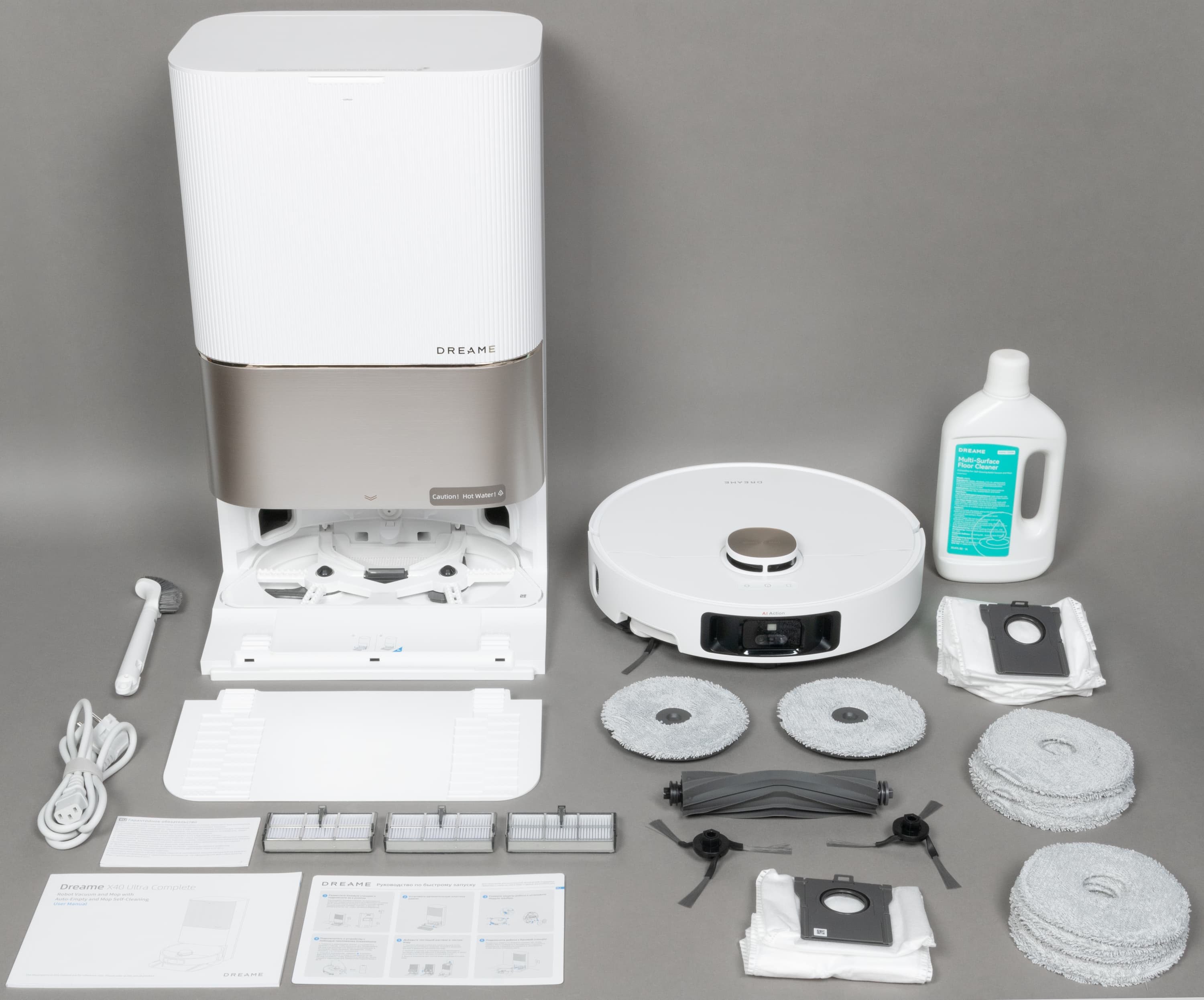 Подводя итог внешнему осмотру, скажем, что робот выглядит и ощущается на твердые пять баллов. Сразу видно, что перед нами премиальное, дорогое и, скорее всего, качественное устройство. К тому же производитель не пожадничал, и положил нам в отдельную коробку все, что потребуется для длительной эксплуатации робота: собственно, слово Complete в названии устройства как раз указывает на расширенную комплектацию с расходниками.