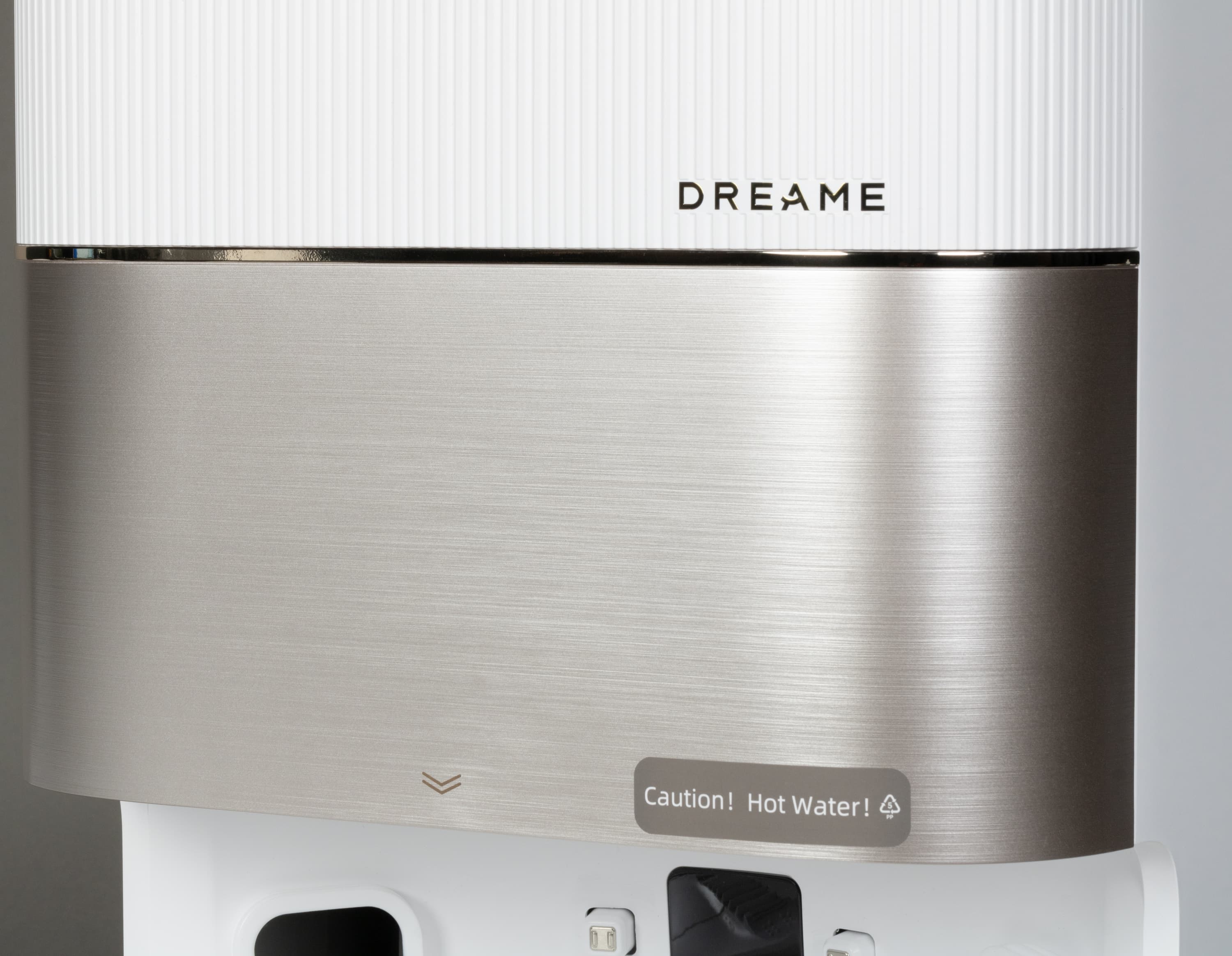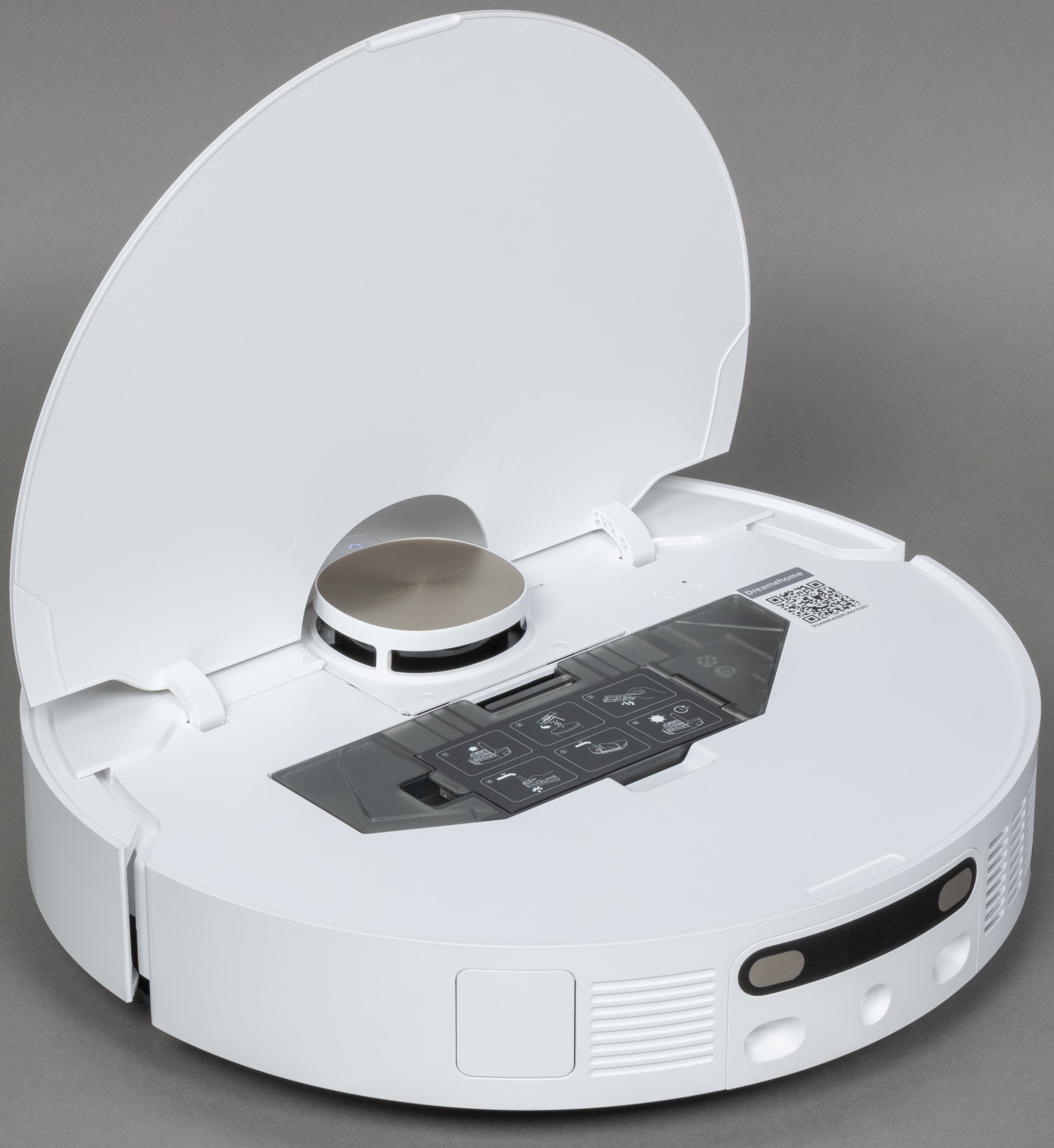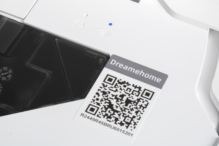 Под верхней панелью находится серийный номер устройства и QR-код для установки фирменного приложения Dreamehome. Рядом находится индикатор подключения к Wi-Fi и утопленная кнопка сброса настроек.