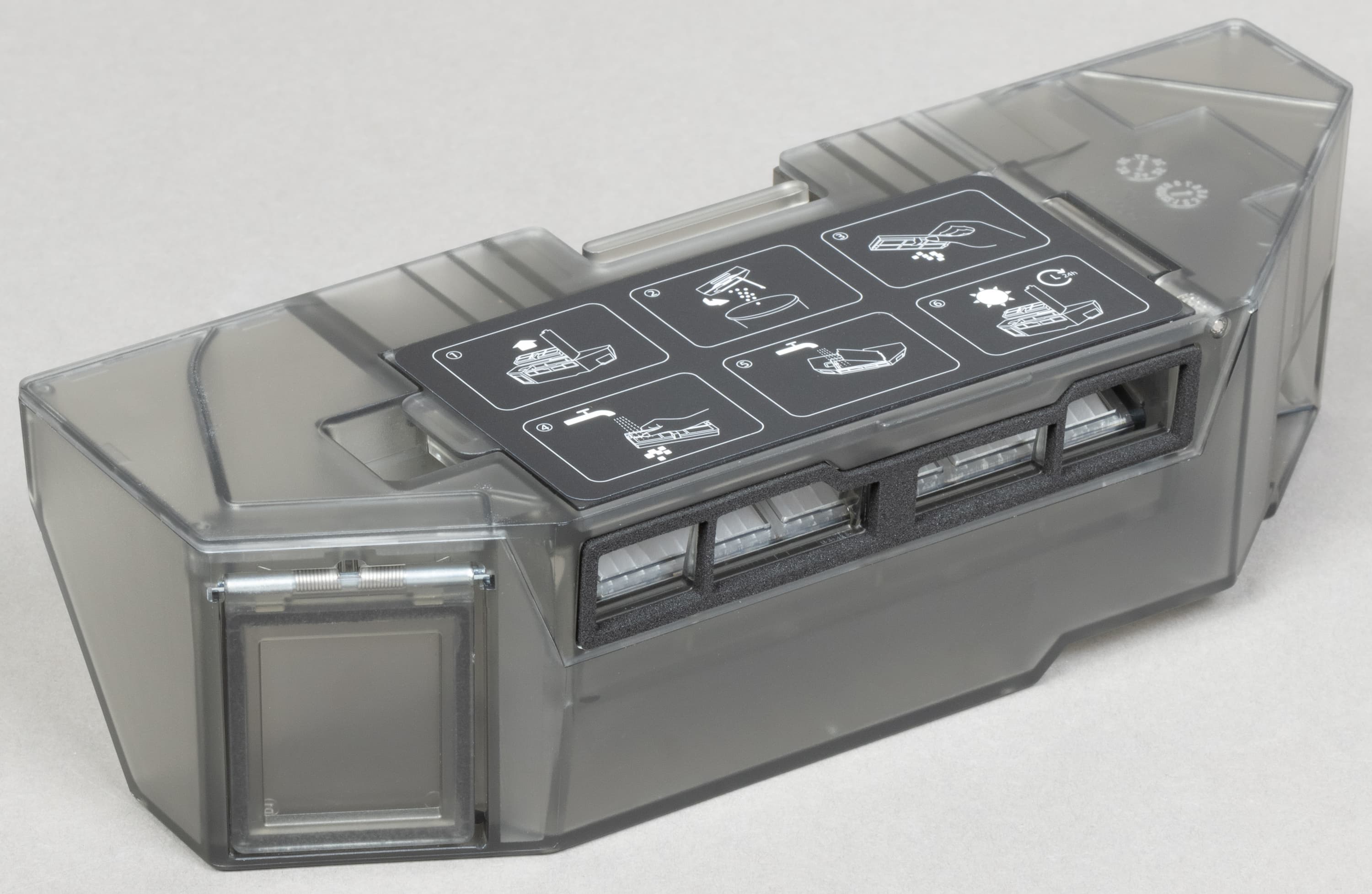 В левой части отсека для сбора мусора находится контейнер для моющего средства. Чистящий раствор сюда нужно доливать по мере необходимости (хотя можно и вовсе обойтись без него).