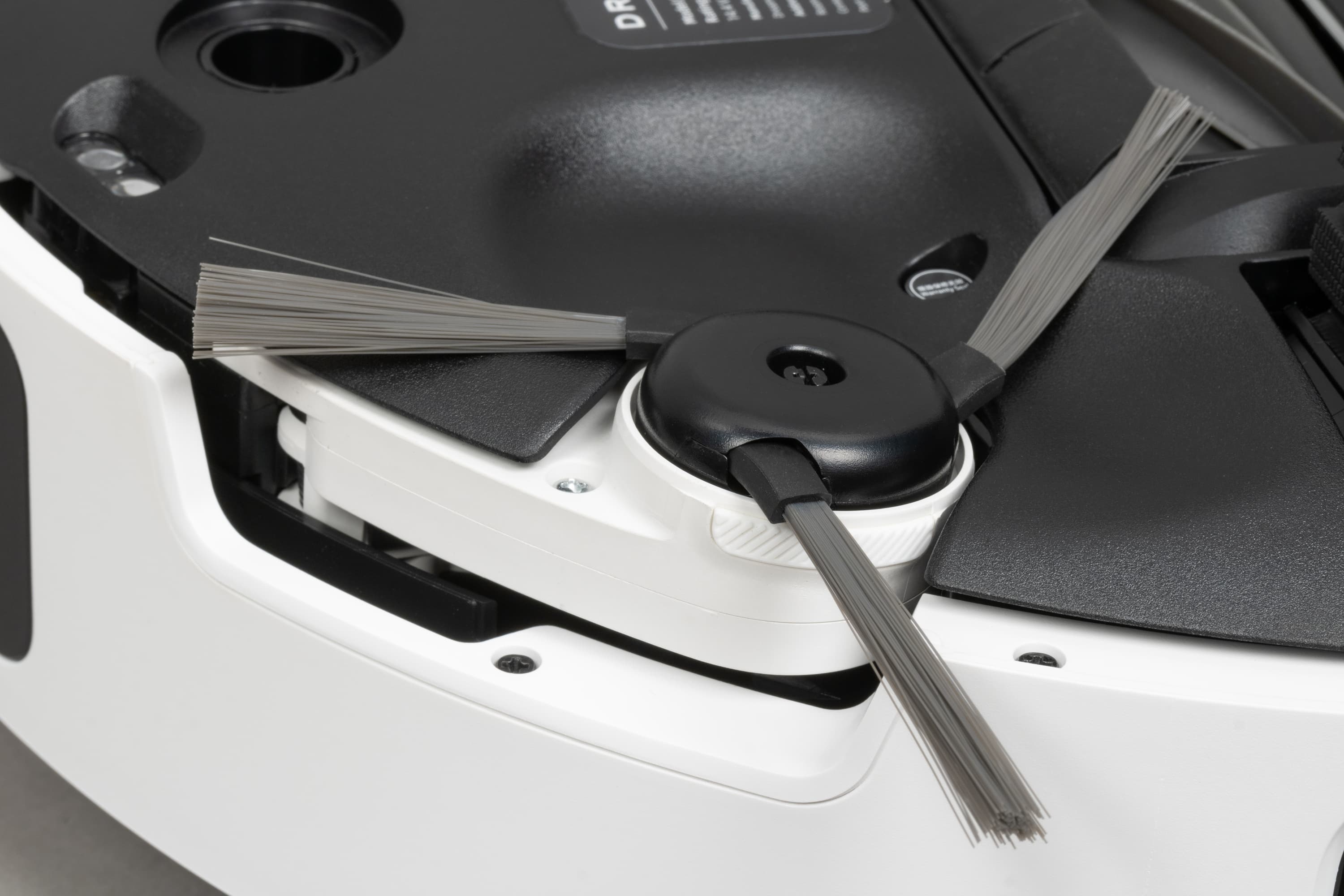 Продолжим разглядывать сенсоры. Со стороны щетки мы видим специальный сенсор, с помощью которого робот определяет расстояние до стен. Таким образом он может путешествовать вдоль них практически вплотную.
