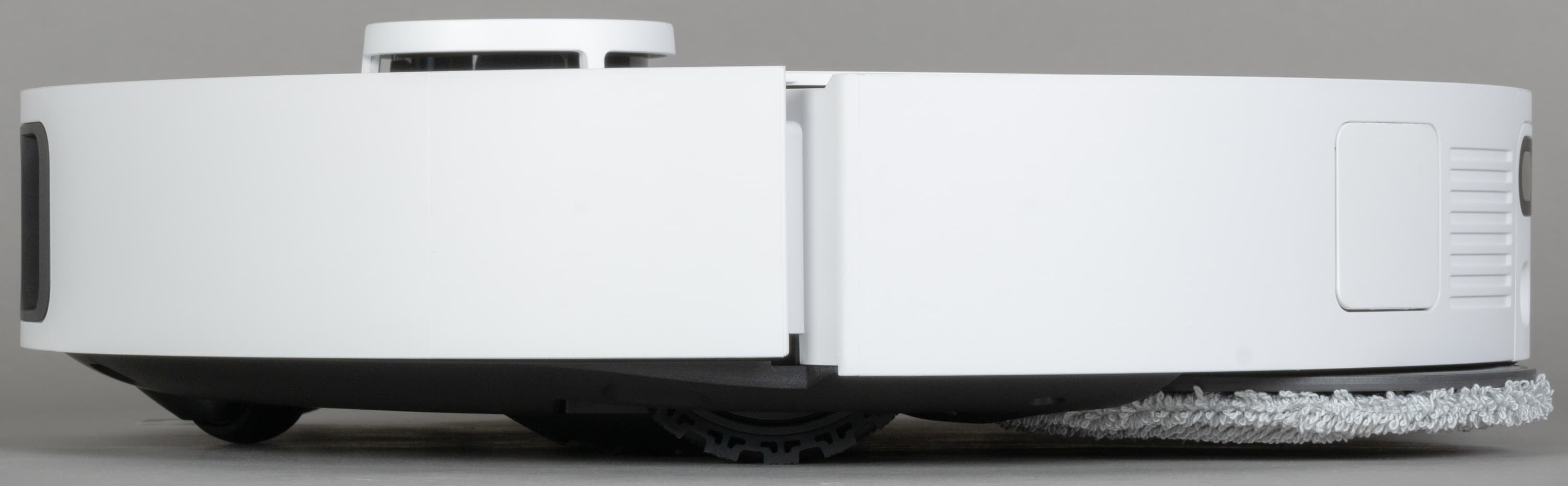 Решетка для выпуска воздуха расположена в «корме» робота, а под корпусом можно видеть насадку для влажной уборки с установленной микрофибровой салфеткой.