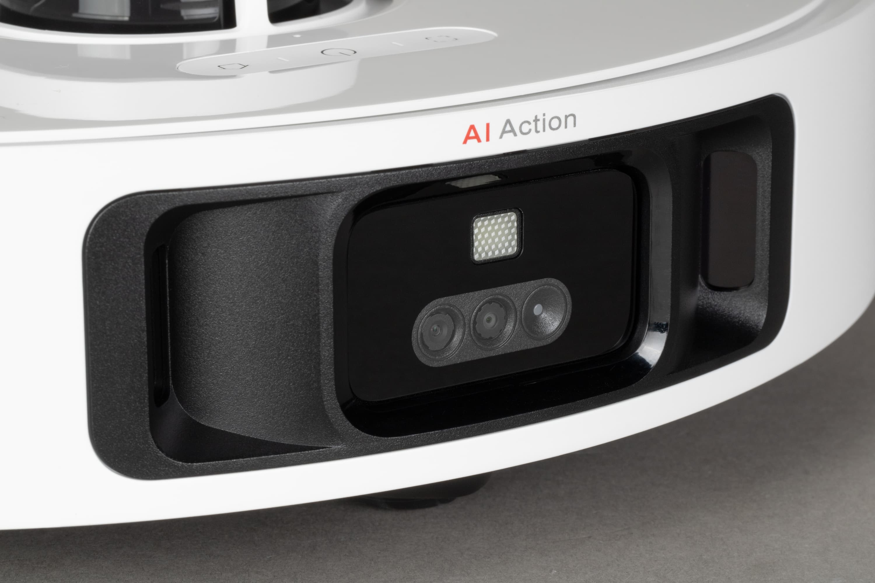 Спереди, как водится, у робота установлен подвижный бампер (он же — физический датчик столкновений). У более бюджетных моделей бампер оснащен лишь инфракрасными сенсорами, а у нашей модели между ними расположилась видеокамера, в том числе выполняющая роль интеллектуального сенсора. Традиционные сенсоры видны справа и слева от нее.