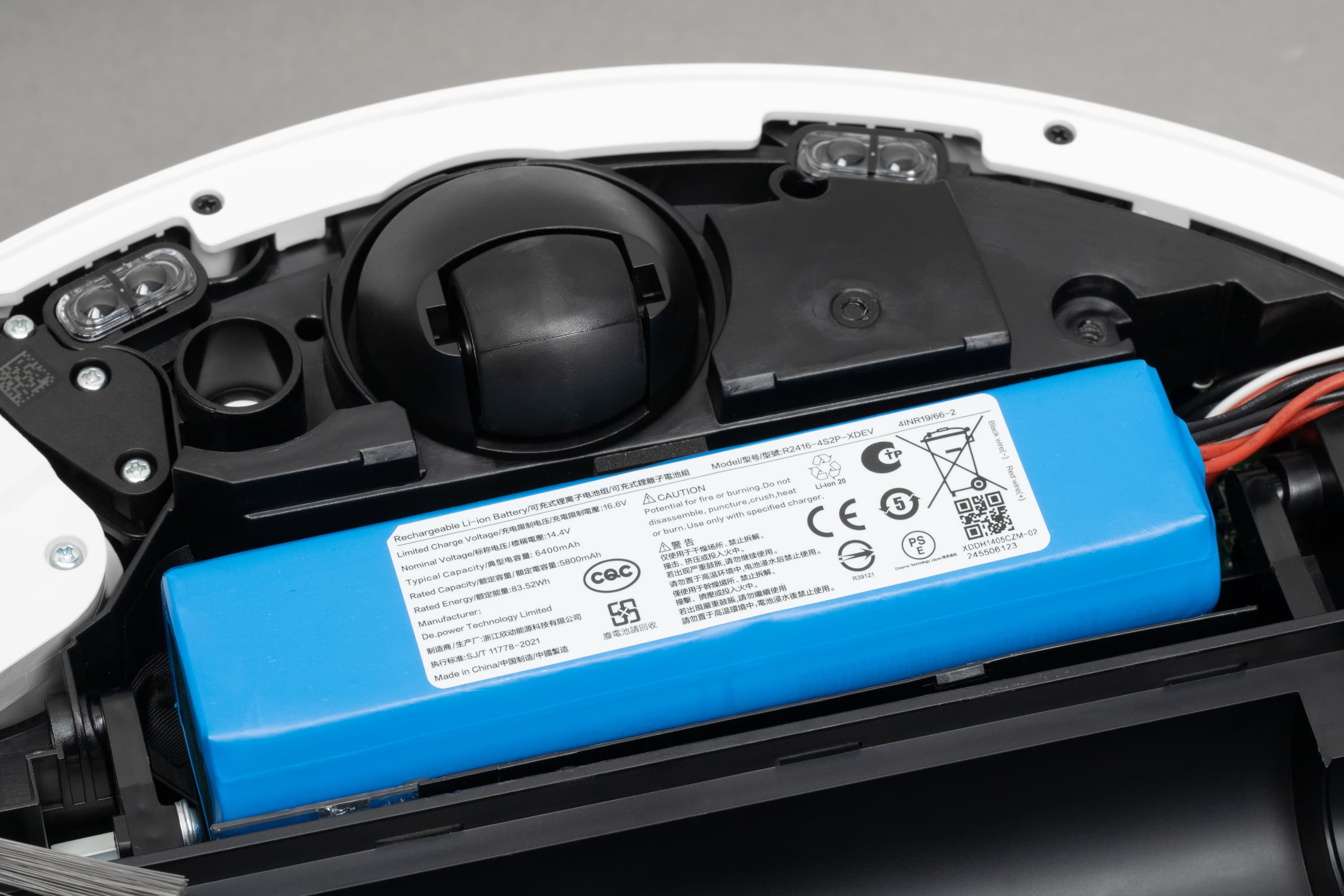 Батарея пылесоса представляет собой сборку из восьми элементов типоразмера АА, обтянутых термоусадочной пленкой. Номинальная емкость сборки составляет 6400 мА·ч (то есть чуть больше, чем более привычные нам 5200 мА·ч).