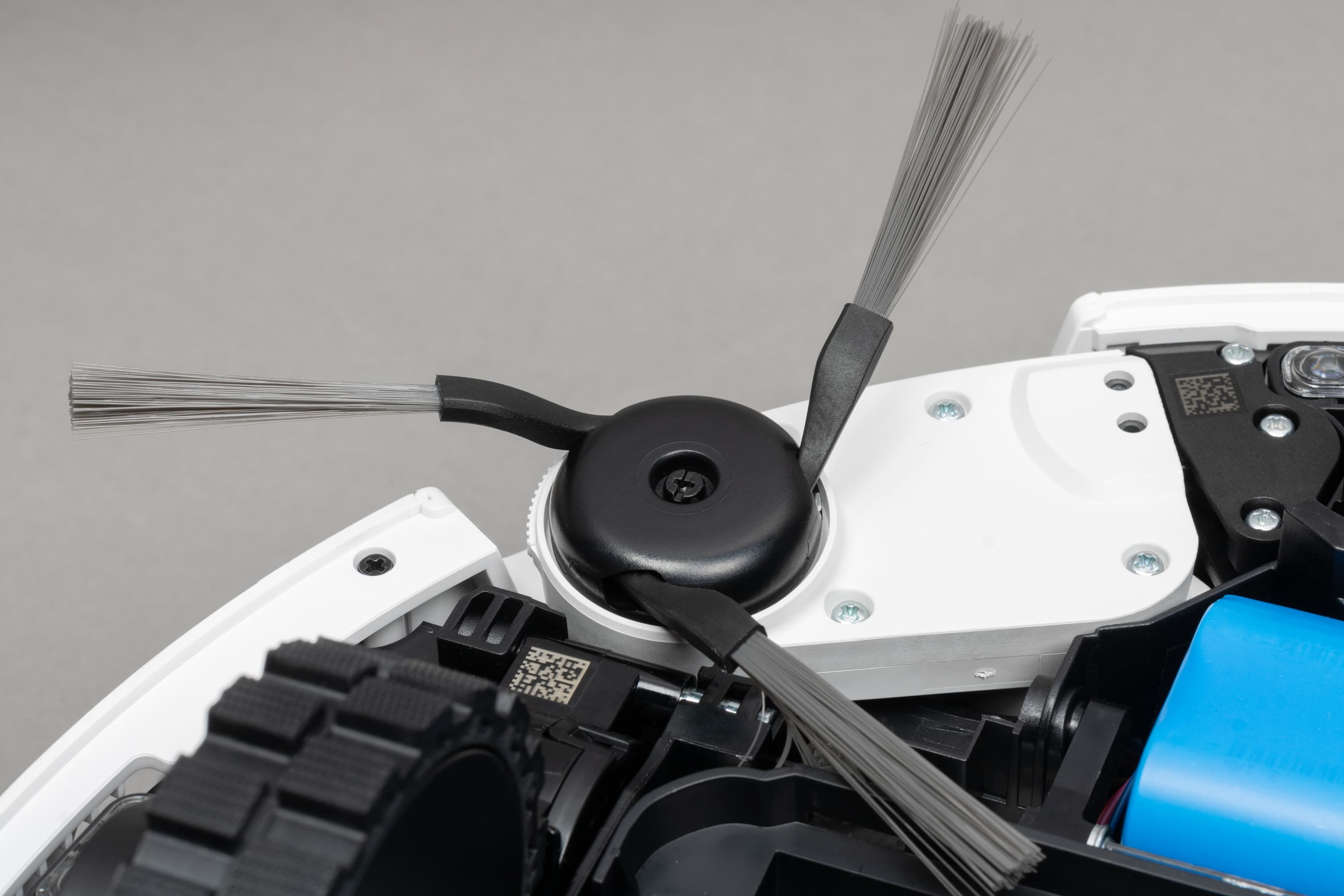 У центральной щетки нет привычных рядов щетины: только мягкие V-образные ламели в шесть рядов. Рамка крепления щетки без перемычек или каких-либо других препятствий, защищающих щетку от наматывания ниток, проводов, шнурков и тому подобных вещей.