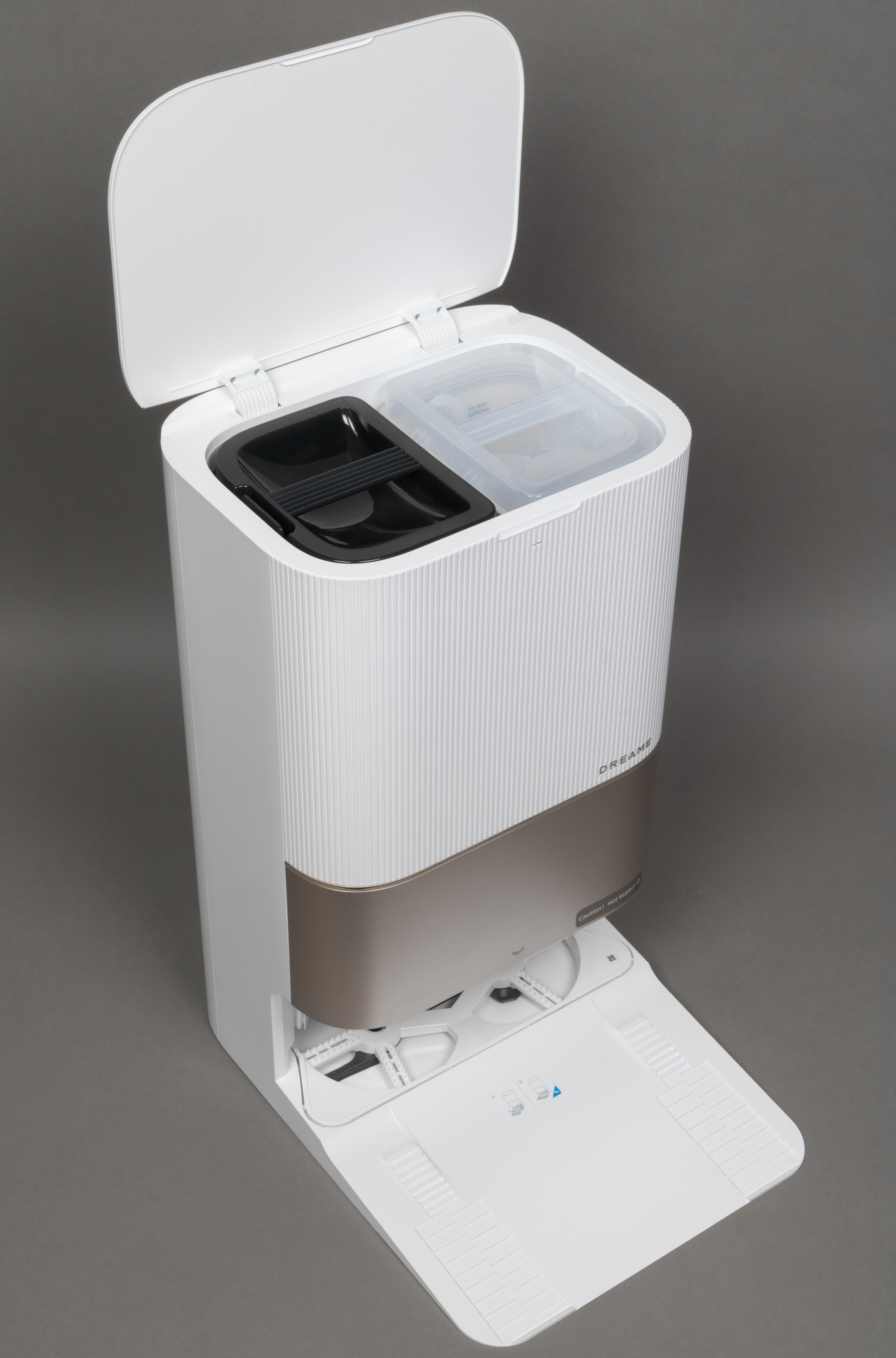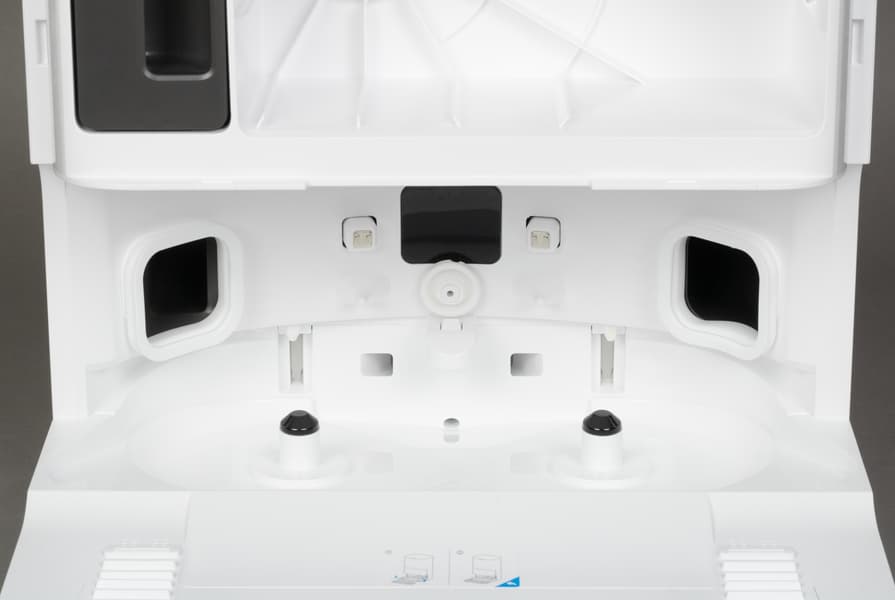 В нижней части находится система самоочистки швабр. После завершения влажной уборки швабры будут автоматически промыты, протерты о специальную пластиковую рамку, и даже просушены теплым воздухом. Сама станция способна подогревать воду для чистки салфеток до 70 градусов. Это относительно новая функция, отсутствующая во многих предыдущих моделях. Однако в топовых пылесосах мы уже такое видели.